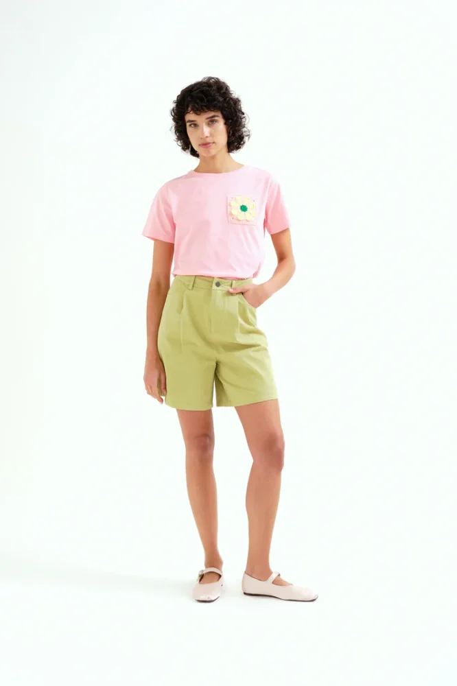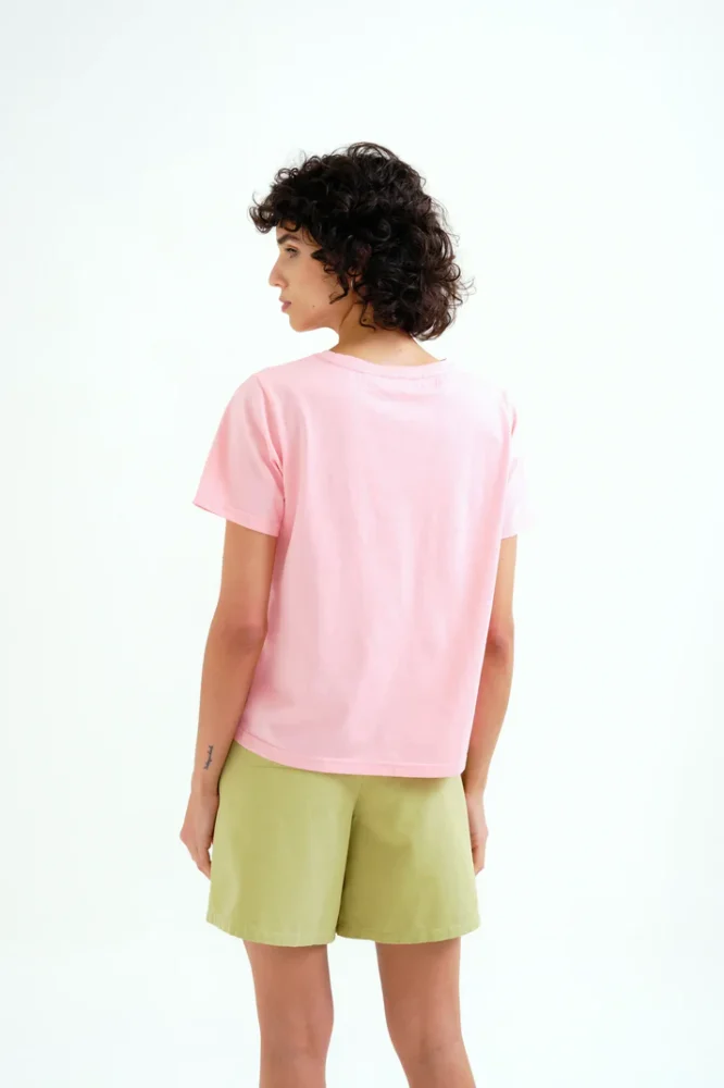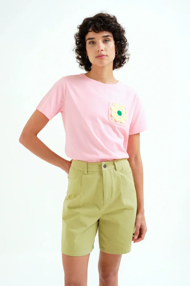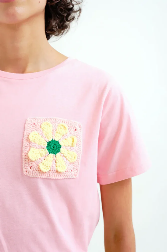 Ροζ μπλουζάκι από 100% βαμβάκι. Στρογγυλή λαιμόκοψη και κοντά μανίκια. Κεντημένη λεπτομέρεια με ηλιοτρόπιο. Το μοντέλο έχει ύψος 175 εκ. και φοράει μέγεθος S.