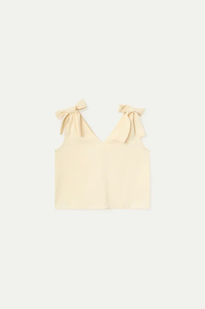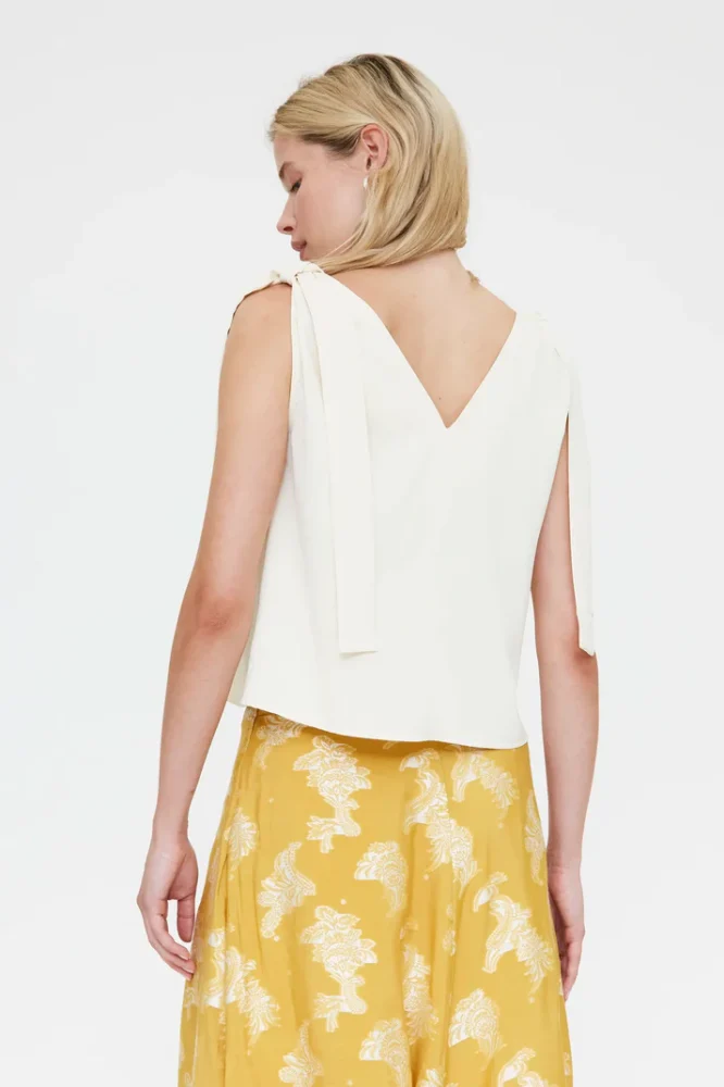 Κρεπ τοπ σε υπόλευκο χρώμα. V ντεκολτέ με τιράντες και αποσπώμενους φιόγκους. Το μοντέλο έχει ύψος 175 εκ. και φοράει μέγεθος S.