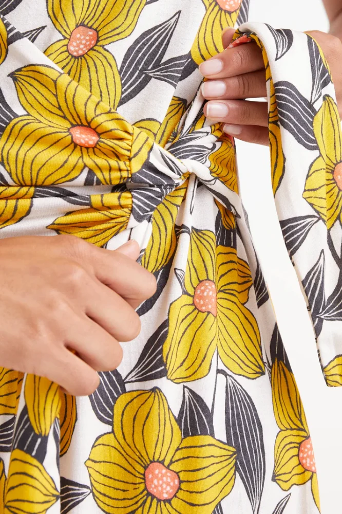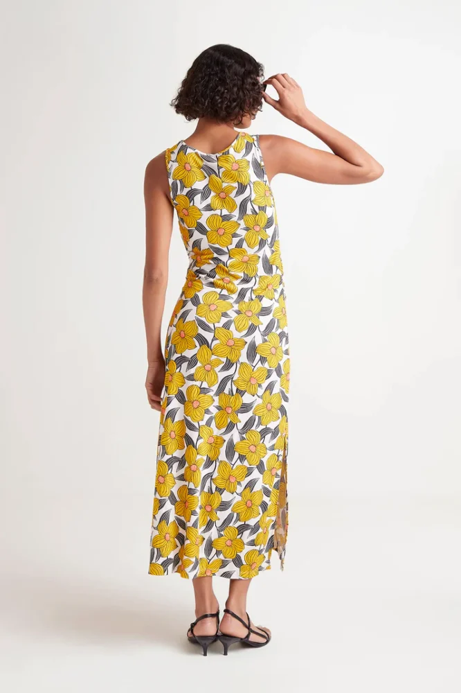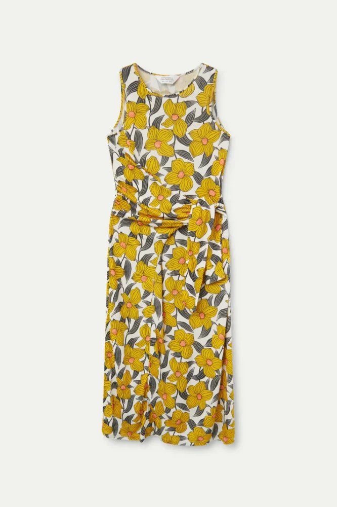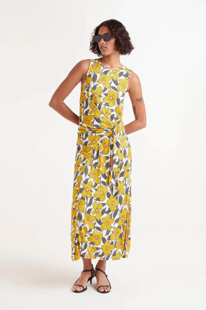 Μακρύ φόρεμα από βισκόζ ζέρσεϊ ύφασμα με φλοράλ στάμπα Narciso. Στρογγυλή λαιμόκοψη και αμάνικο. Μοντέλο με υφαντή ζώνη μπροστά. Κλείσιμο πίσω με σχισμή και κουμπί.
