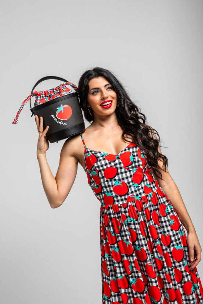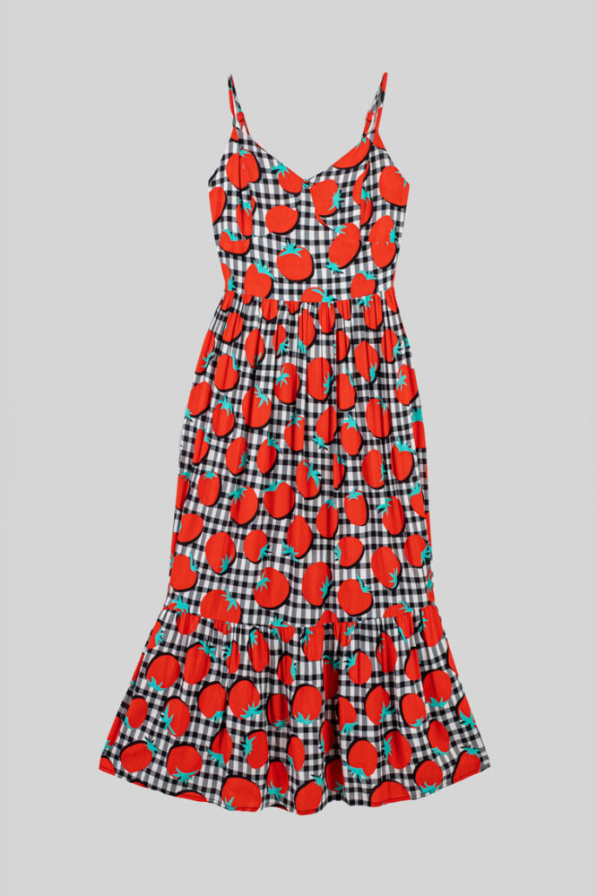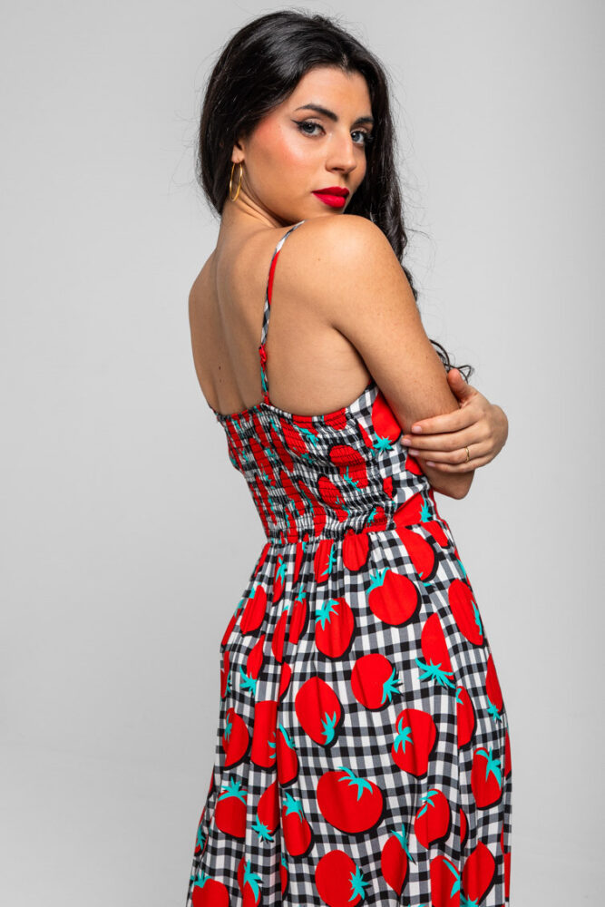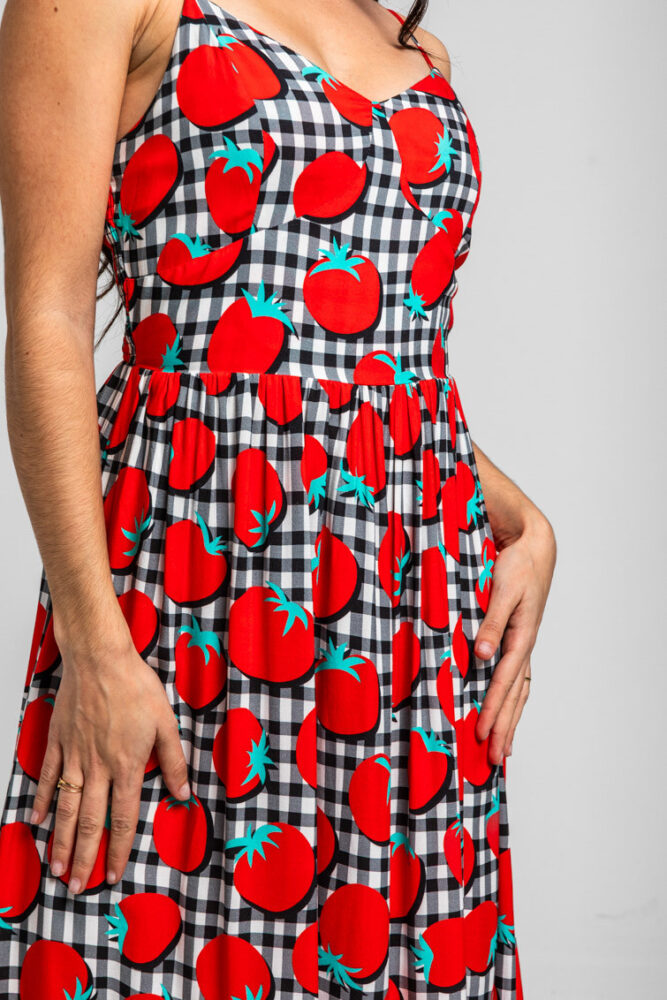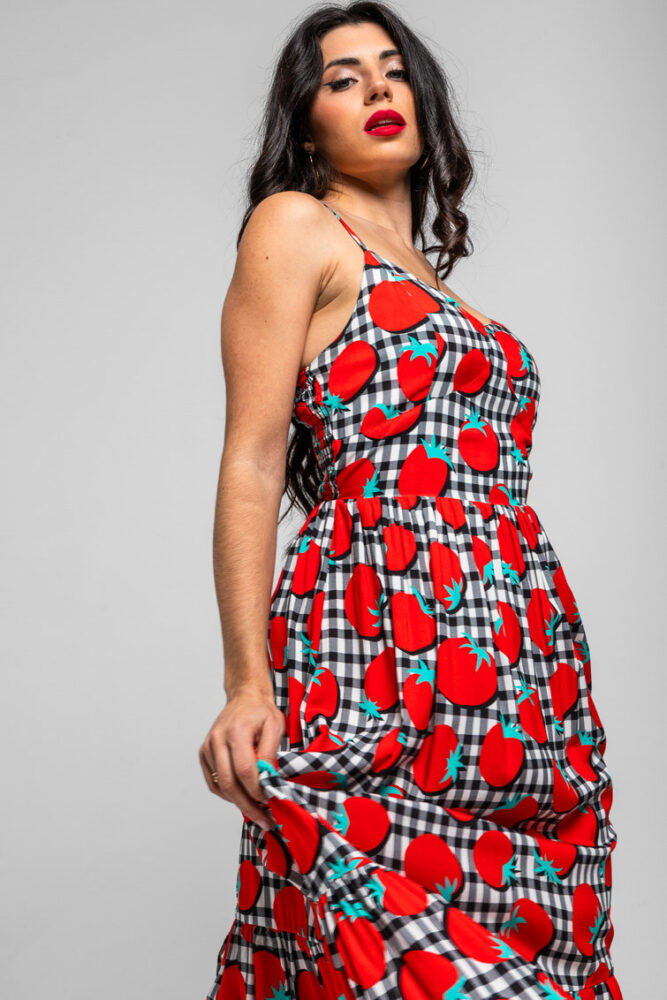 Pomodori: Φόρεμα μπουστάκι με στάμπα ντομάτας – Ασπρόμαυρο φόρεμα μίντι με καρό και ντομάτα: Μίντι φόρεμα από ύφασμα με φαρδιά τιράντες. Μπούστο σε στυλ μπουστάκι με ανοίγματα στα cups και στις πλαϊνές ραφές για δομή. Σχηματική μέση και φαρδιά φούστα με φαρδιά, σγουρά βολάν στο στρίφωμα. – 100% βισκόζη.