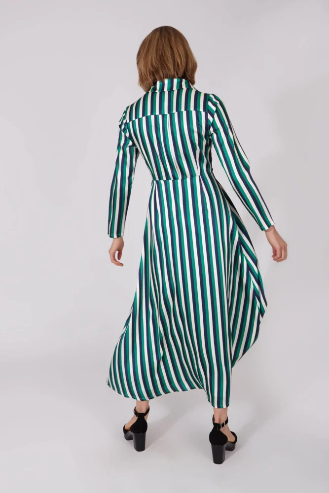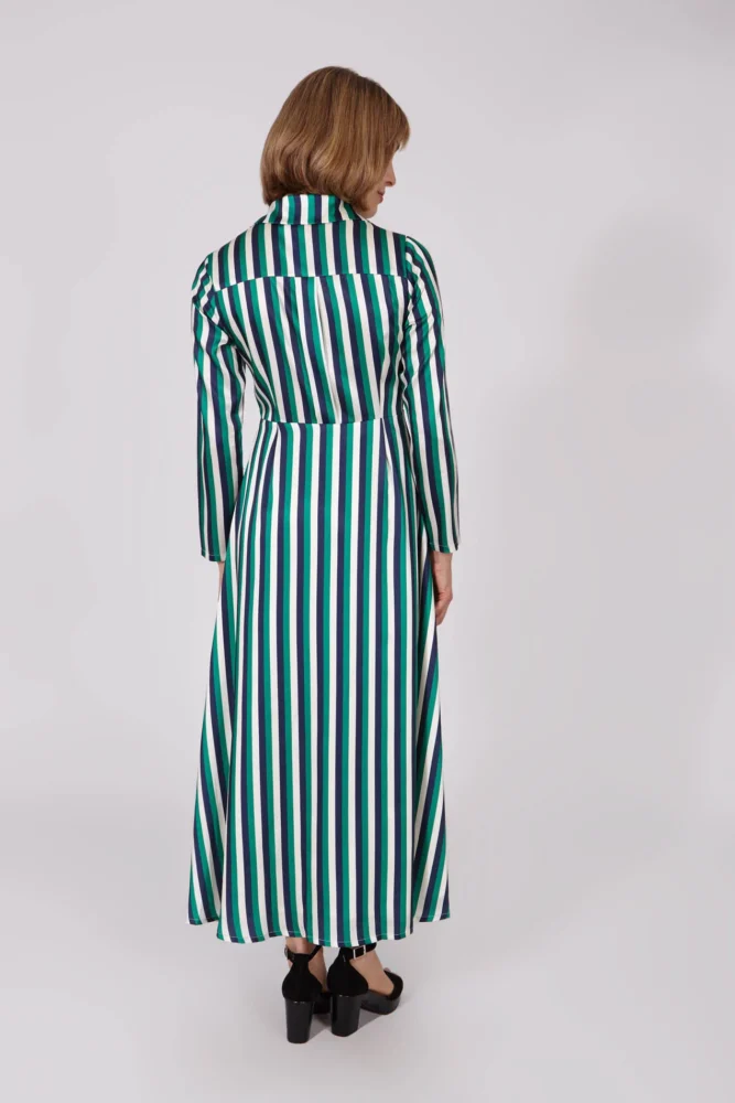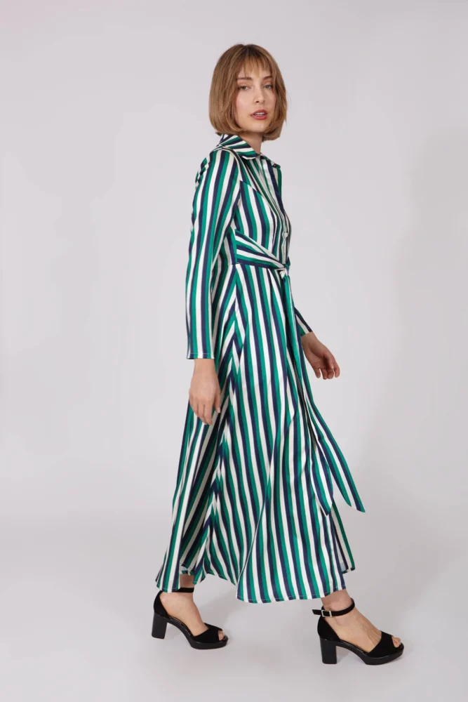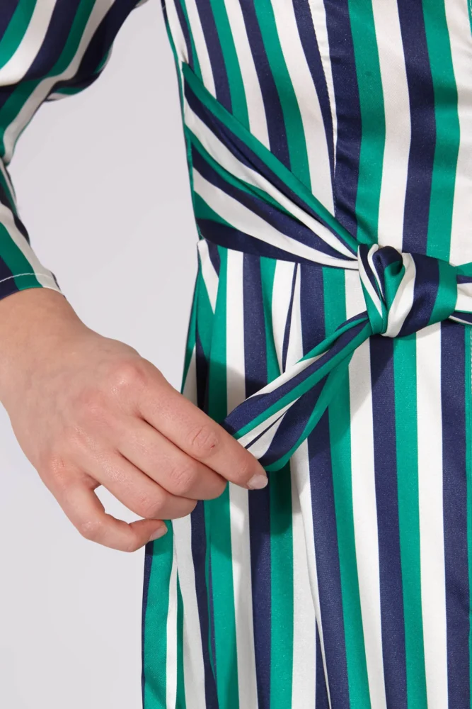 Φόρεμα μακρύ σεμιζιέ, silk touch, με ριγέ print σε πράσινο και μπλε χρώμα και ενσωματωμένη ζώνη. Το Smile are limited edition, υπάρχουν μόνο 180 μονάδες αυτού του ενδύματος στον κόσμο.