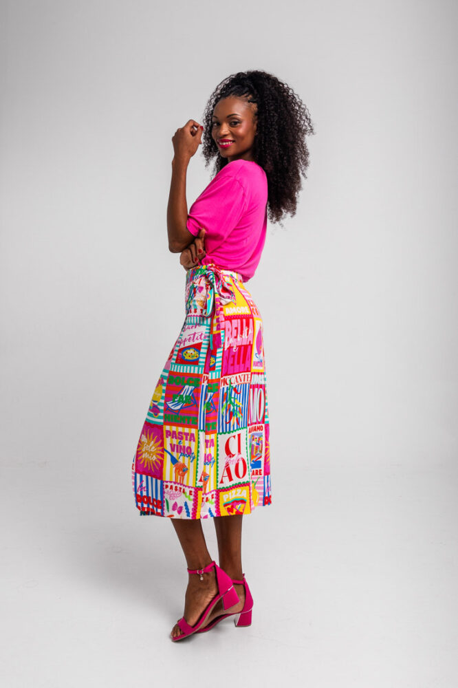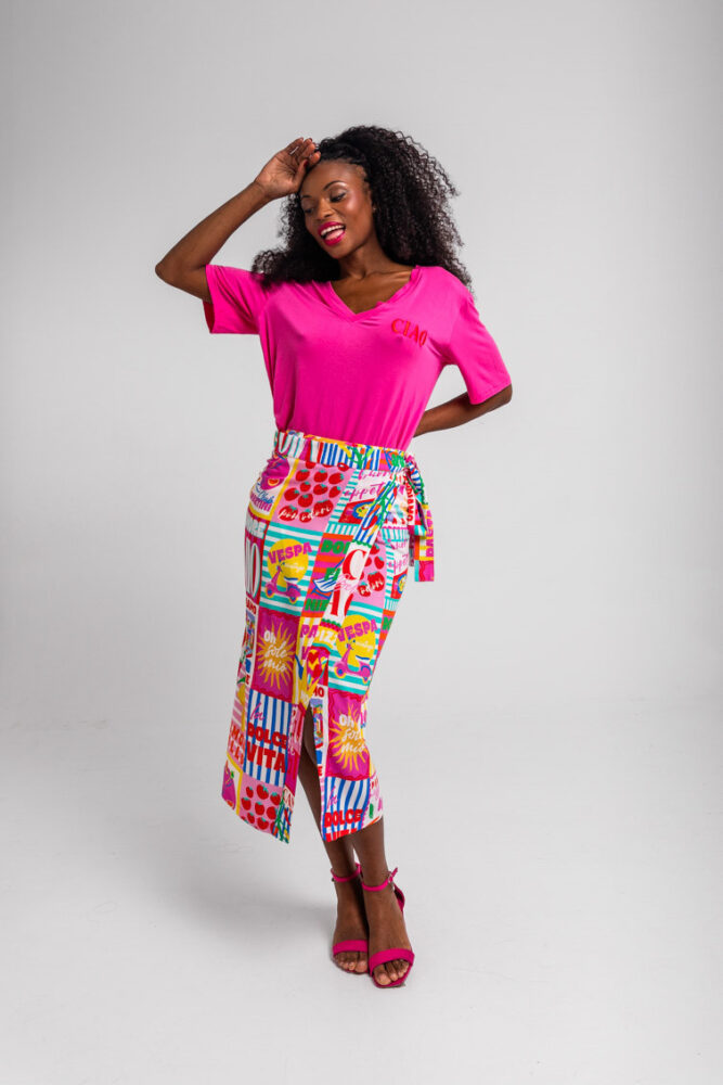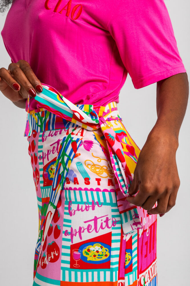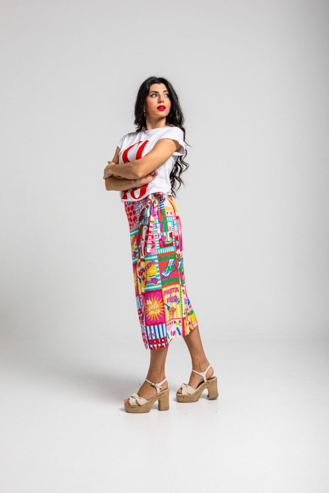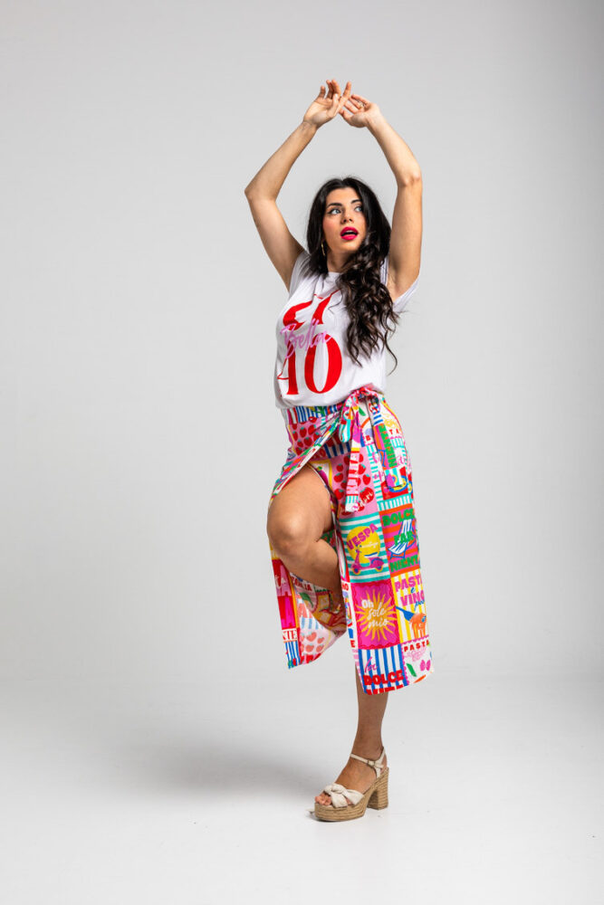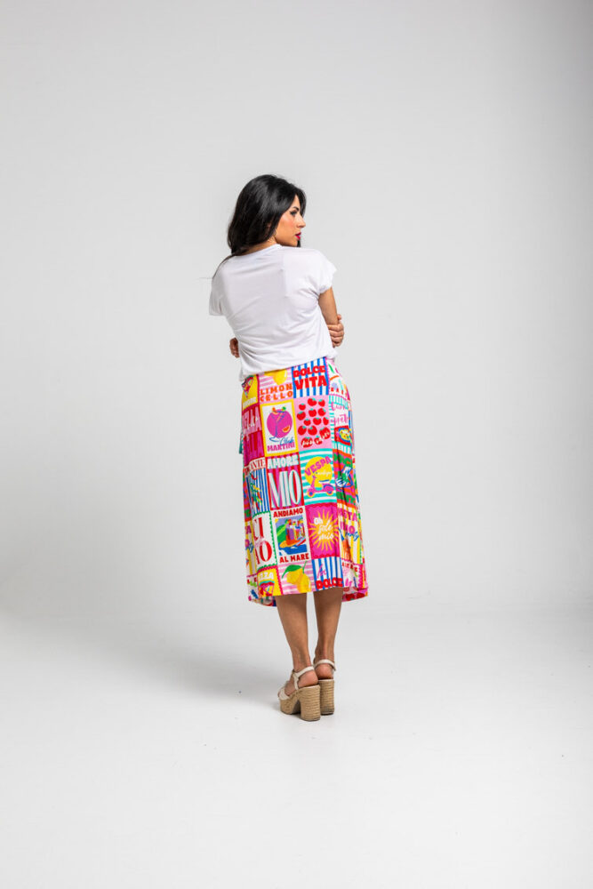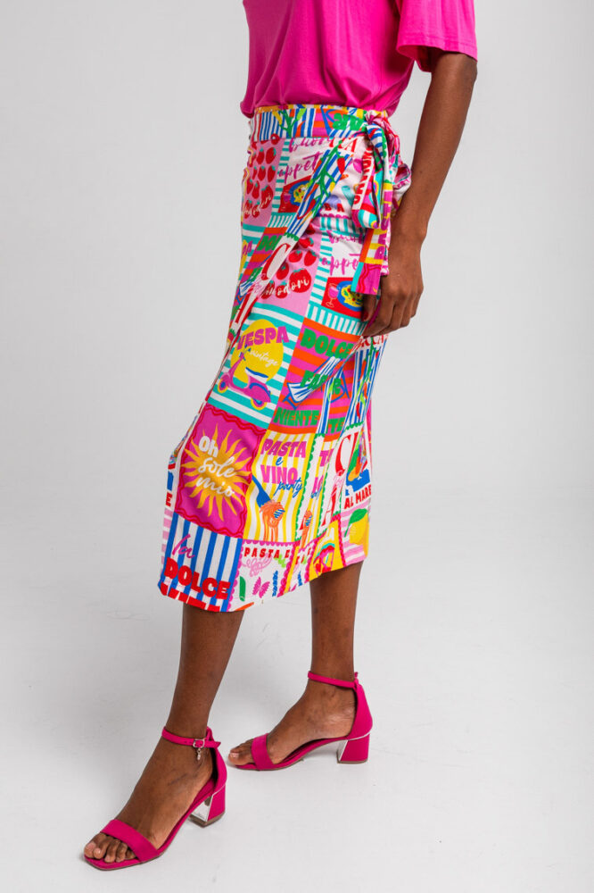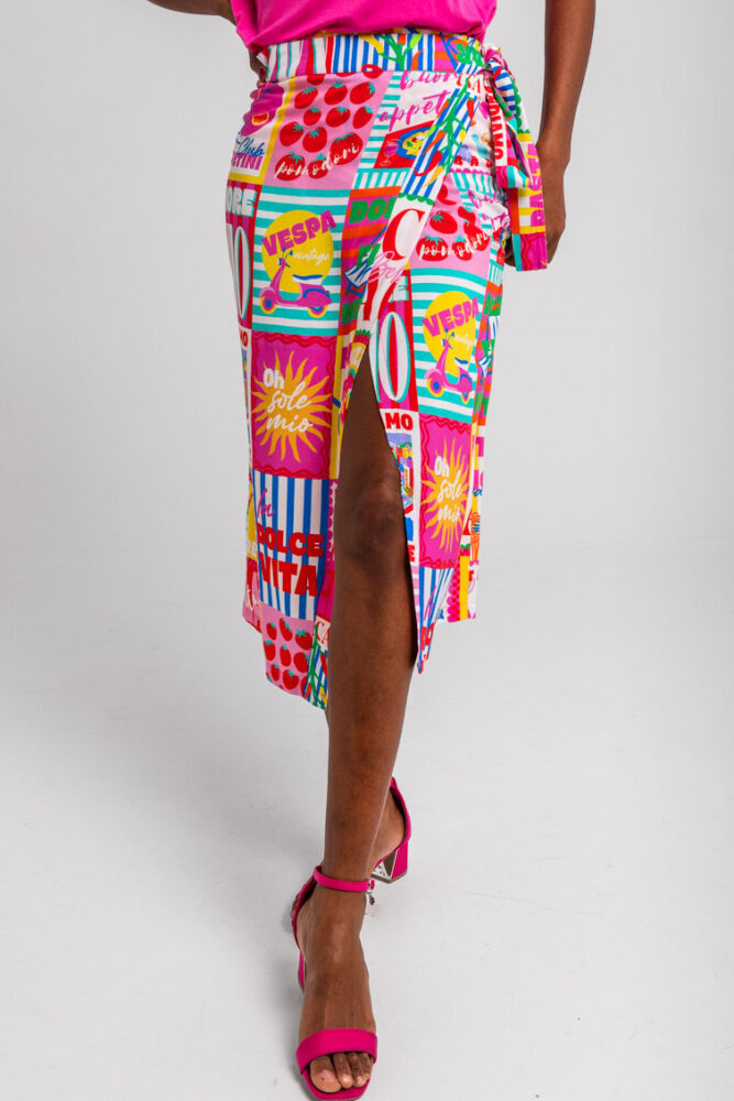 Dolce Far Niente: Ας το απολαύσουμε, με πολλά ζυμαρικά και άφθονο Limoncello, ντομάτες, Martini και πίτσα, αγάπη μου – Ιταλική φούστα Midi με τυπωμένο κολάζ: Φούστα σε στυλ σαρόνγκ με ασύμμετρο crossover μπροστά. Κλείσιμο με δέσιμο. Μήκος μέχρι το γόνατο, με μπροστινό σκίσιμο που δημιουργείται από το crossover. – 100% βισκόζη