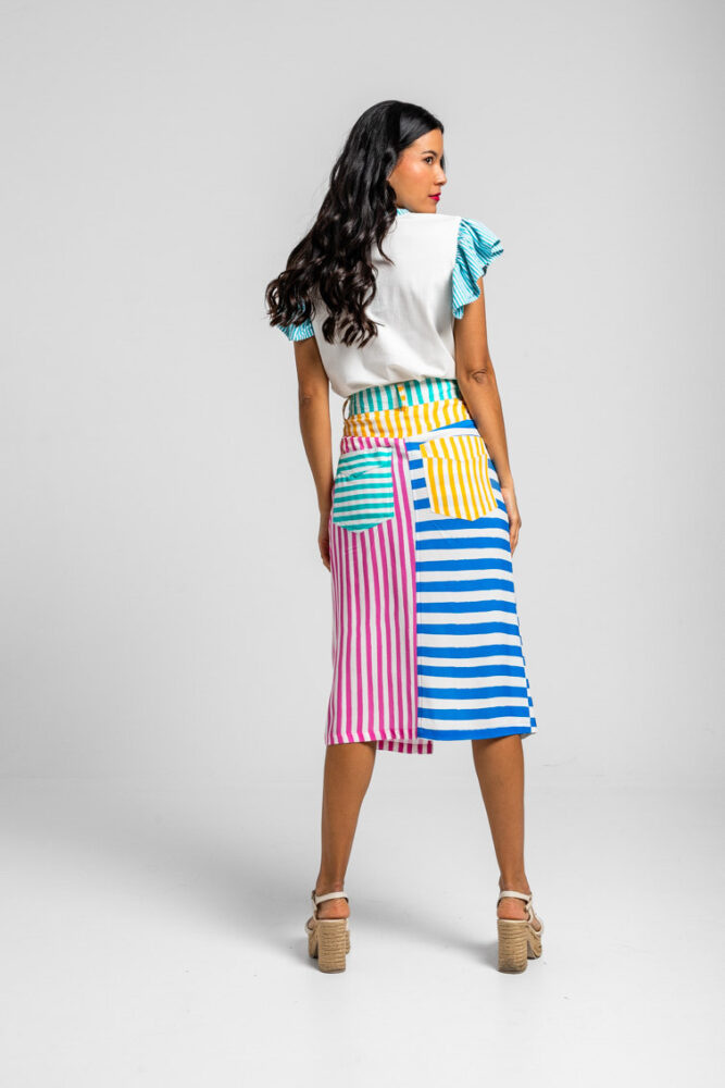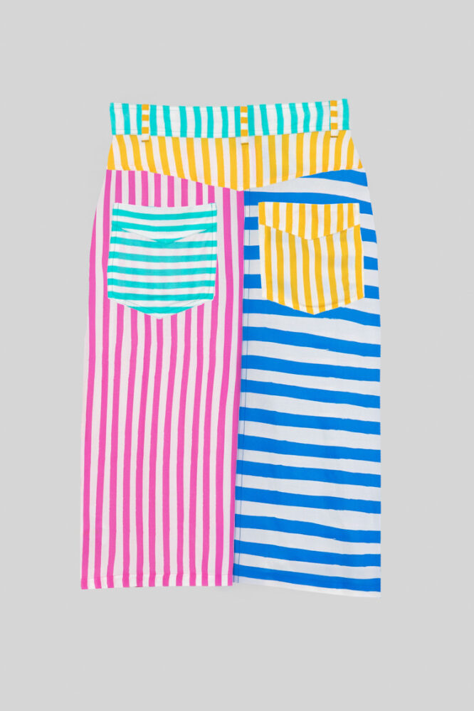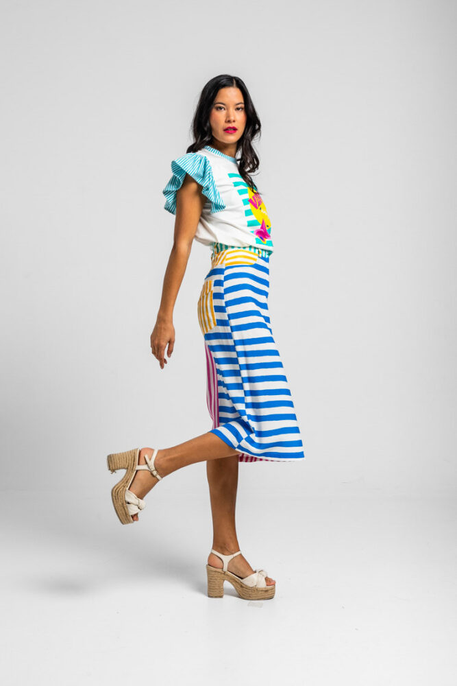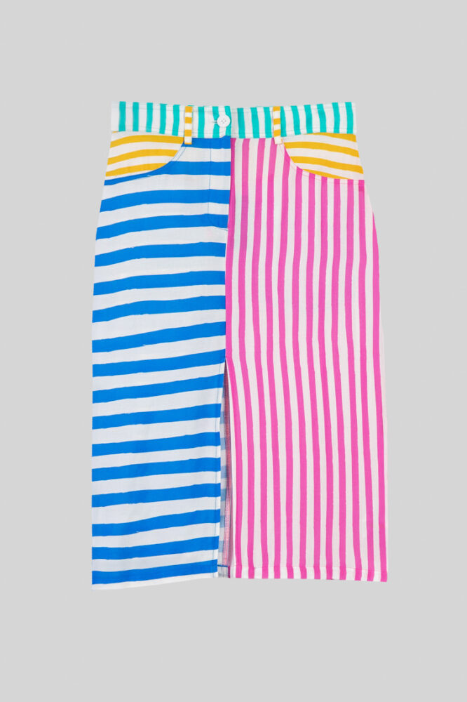Dolce vita: γιατί η γλυκιά ζωή είναι πιο εύπεπτη – Φούστα Midi με ριγέ τζιν: Μίντι φούστα με τσέπες και σκίσιμο μπροστά. Ψηλόμεσο στυλ με κλείσιμο με φερμουάρ και κουμπιά. – 100% βισκόζη.