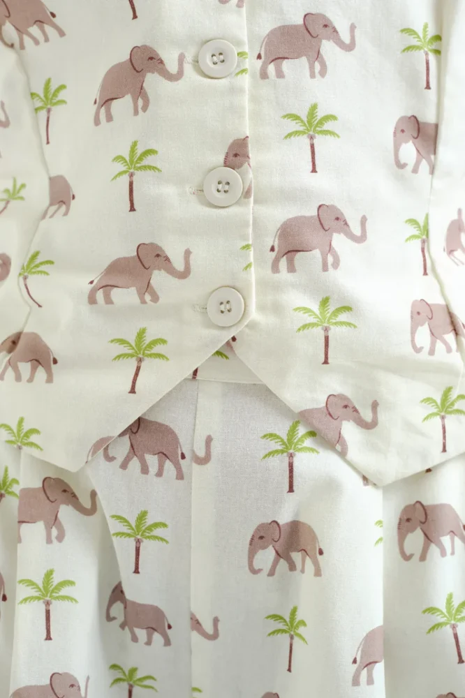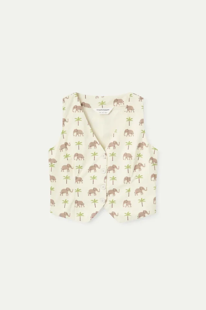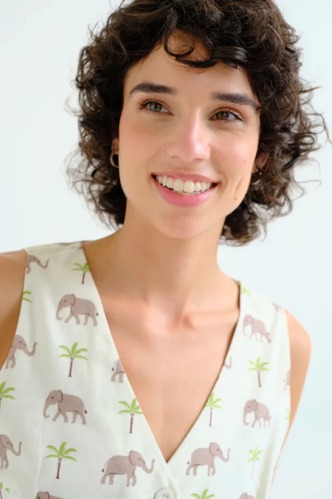 Γιλέκο από 100% βαμβάκι με τύπωμα ελέφαντα. Με V ντεκολτέ και αμάνικο. Κλείσιμο μπροστά με κουμπιά και λευκά κουμπιά. Φόδρα. Το μοντέλο έχει ύψος 175 εκ. και φοράει μέγεθος S.