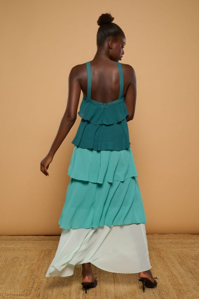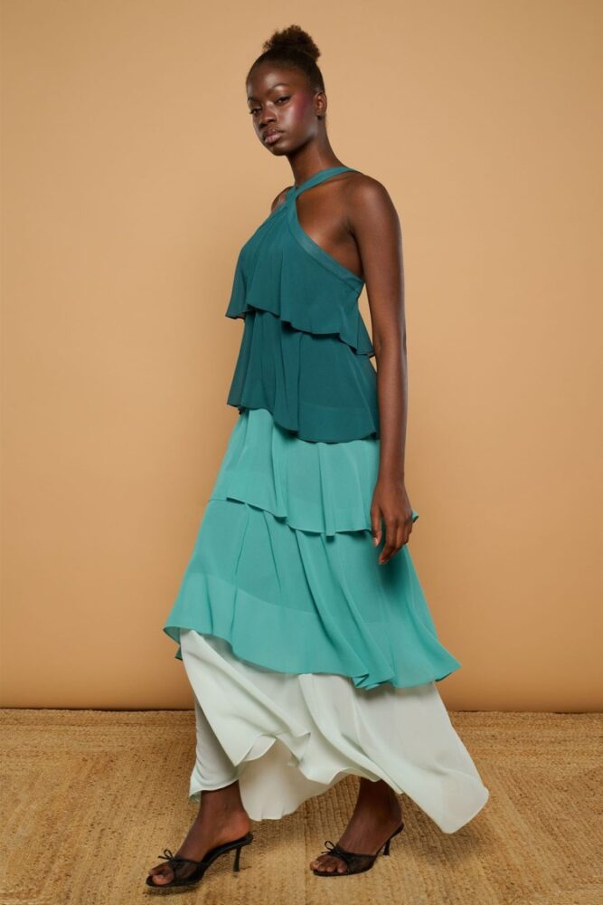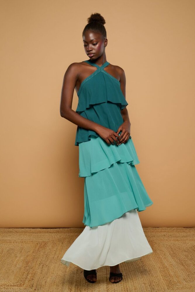 Μακρύ φόρεμα με παρτούς ώμους, halter neck και βολάν σε όλο το μήκος. Κλείνει στη πλάτη με φερμουάρ.