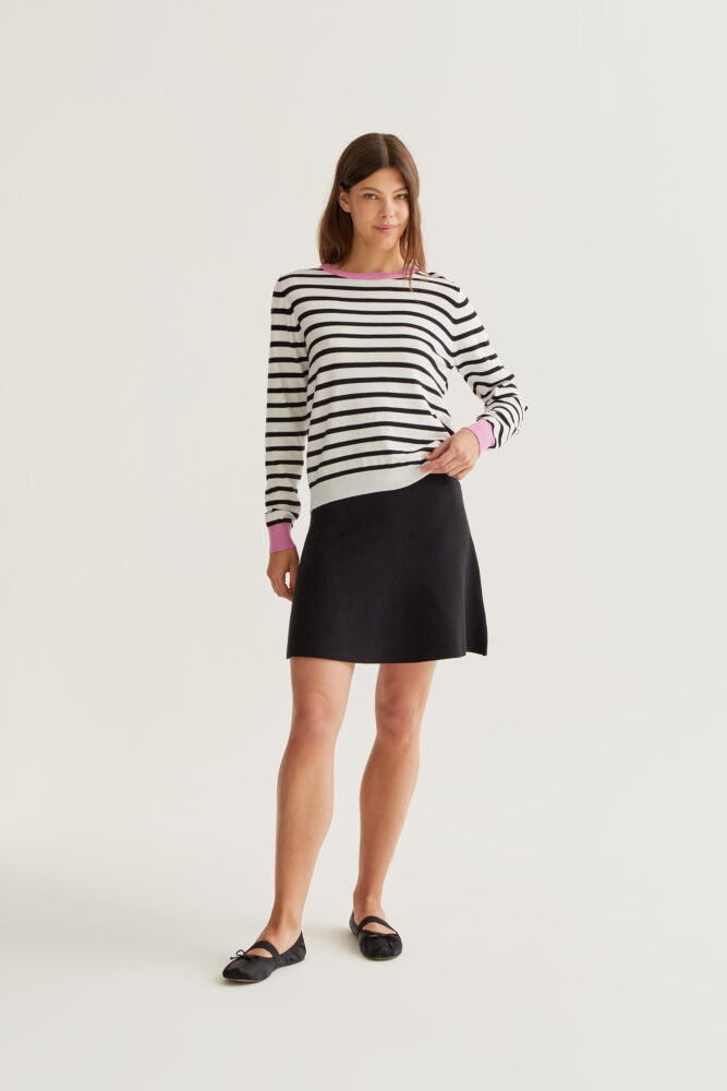 Πλεκτό πουλόβερ με ρίγες σε λευκό και μαύρο χρώμα. Στρογγυλή λαιμόκοψη και μακριά μανίκια με ροζ λεπτομέρειες. Ριμπ τελείωμα. Το μοντέλο έχει ύψος 173 εκ. και φοράει μέγεθος S.
