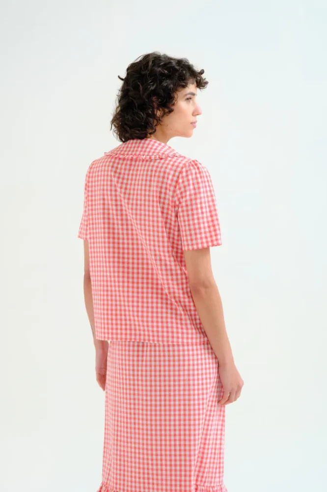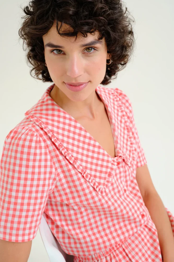 Κόκκινο καρό πουκάμισο από 100% βαμβάκι. Γιακάς και κοντά μανίκια με τον Πίτερ Παν. Κλείσιμο μπροστά με κουμπιά και κόκκινα κουμπιά. Το μοντέλο έχει ύψος 175 εκ. και φοράει μέγεθος S.