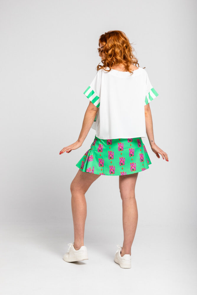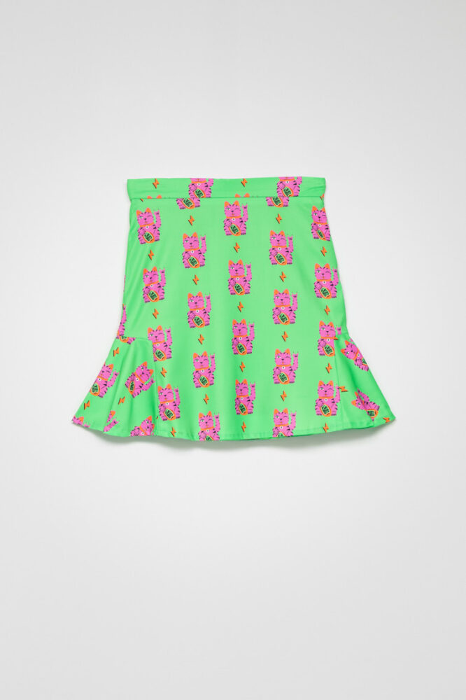 «BYE BYE BAD LUCK» – Φούστα με βολάν: Μίνι φούστα με βολάν στο πλάι, φερμουάρ στο πλάι και λάστιχο στην πίσω μέση. – 100% Πολυεστέρας: Πλένεται στο πλυντήριο σε κρύο νερό. Μη χρησιμοποιείτε λευκαντικά. Μην χρησιμοποιείτε στεγνωτήριο. Στεγνώστε στη σκιά. Σιδερώστε σε χαμηλή θερμοκρασία, κάτω από 100 ºC. Σίδερο μέσα προς τα έξω. Μην αφήνετε το σίδερο να στέκεται πάνω στο ρούχο. Πλύνετε με παρόμοια χρώματα.