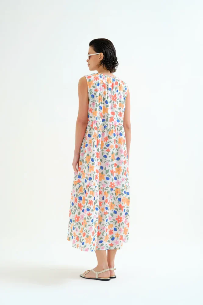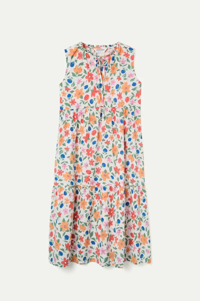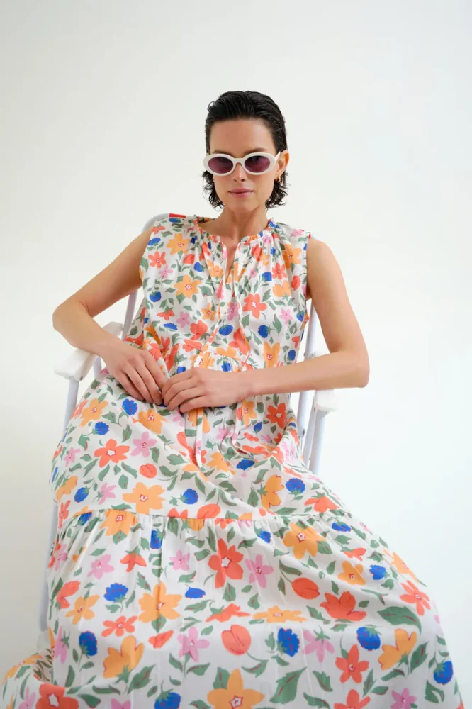 Μακρύ φόρεμα από 100% βαμβάκι με τύπωμα κρίνου. Στρογγυλή λαιμόκοψη με ρυθμιζόμενα κορδόνια περίσφιξης και V λαιμόκοψη. Αμάνικο. Λεπτομέρεια με βολάν στη φούστα. Το μοντέλο έχει ύψος 177 εκ. και φοράει μέγεθος S.