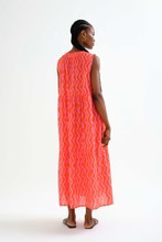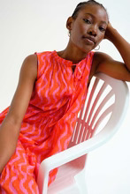 Μακρύ φόρεμα από 100% βαμβάκι με τύπωμα wave. Στρογγυλή λαιμόκοψη με ρυθμιζόμενα κορδόνια περίσφιξης και V λαιμόκοψη. Αμάνικο. Λεπτομέρεια με βολάν στη φούστα. Το μοντέλο έχει ύψος 177 εκ. και φοράει μέγεθος S.