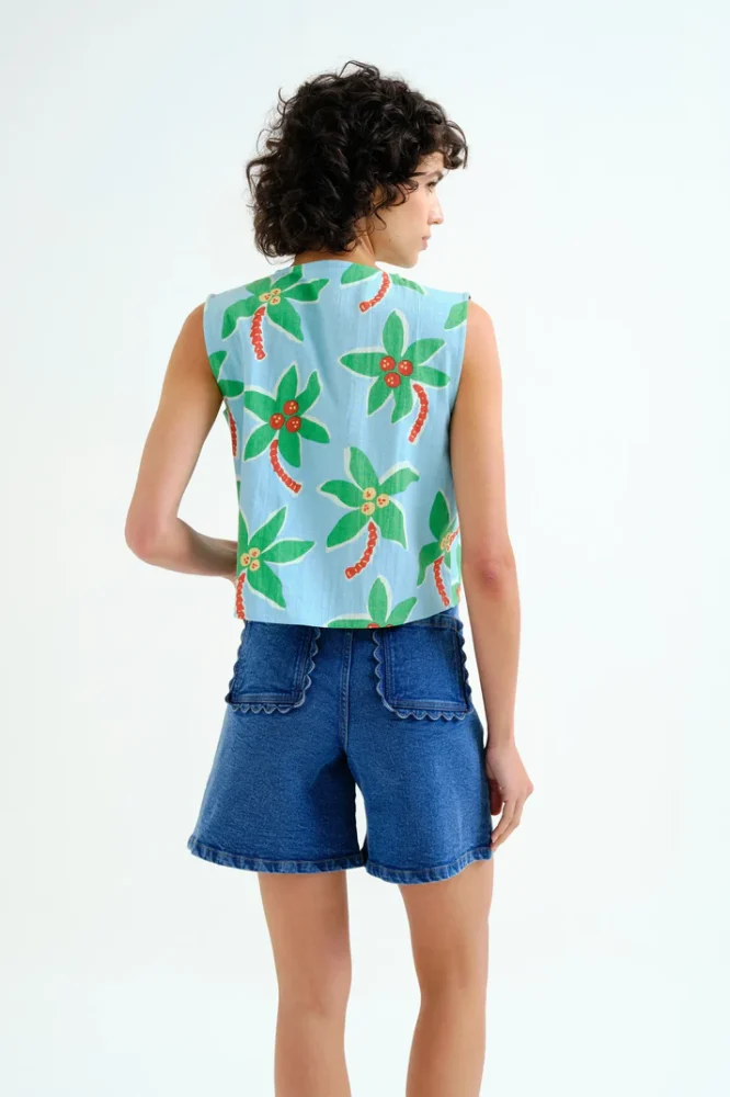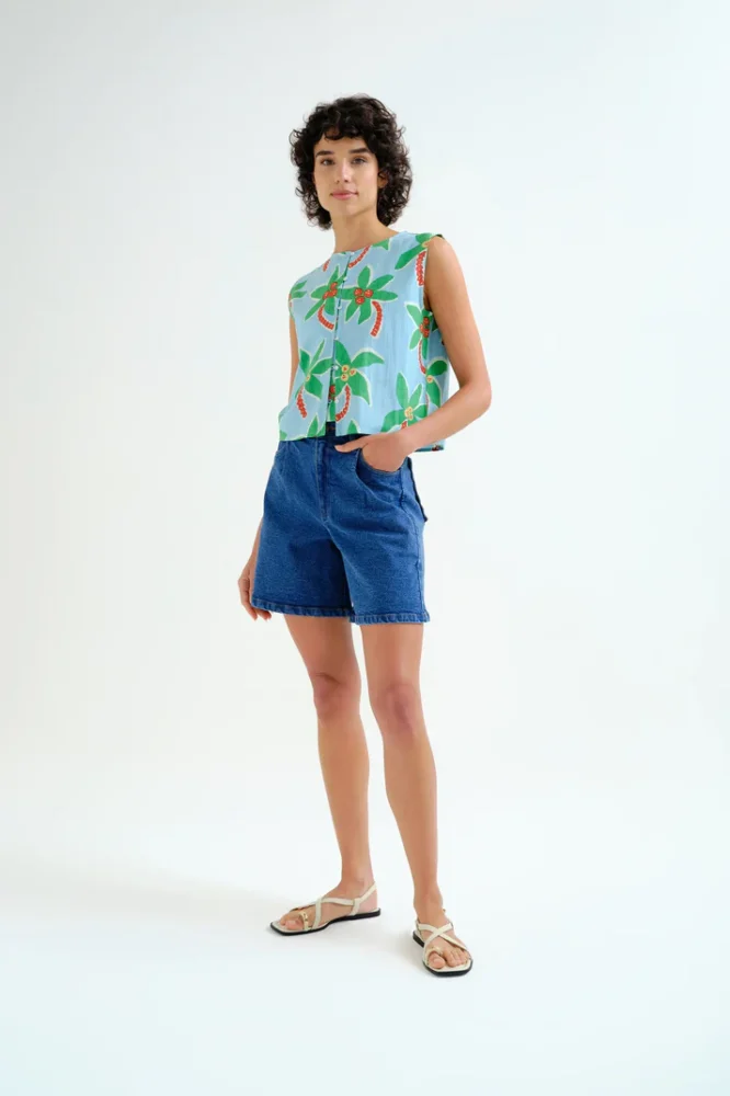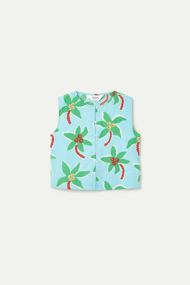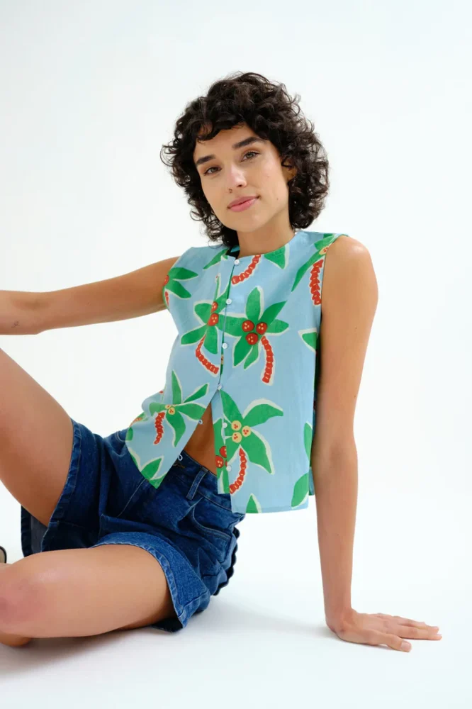 Μπλούζα από 100% βαμβάκι με μεγάλο τύπωμα καρύδας. Στρογγυλή λαιμόκοψη και αμάνικο. Κλείσιμο μπροστά με κουμπιά και λευκά κουμπιά. Το μοντέλο έχει ύψος 175 εκ. και φοράει μέγεθος S.