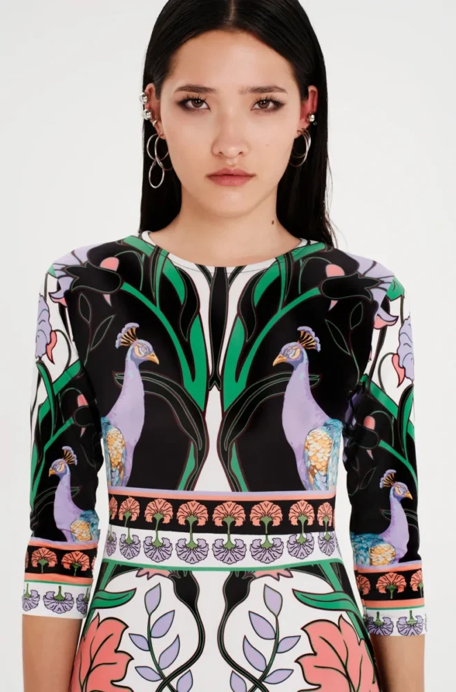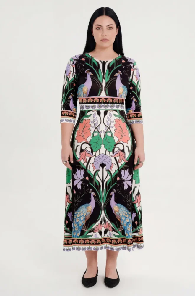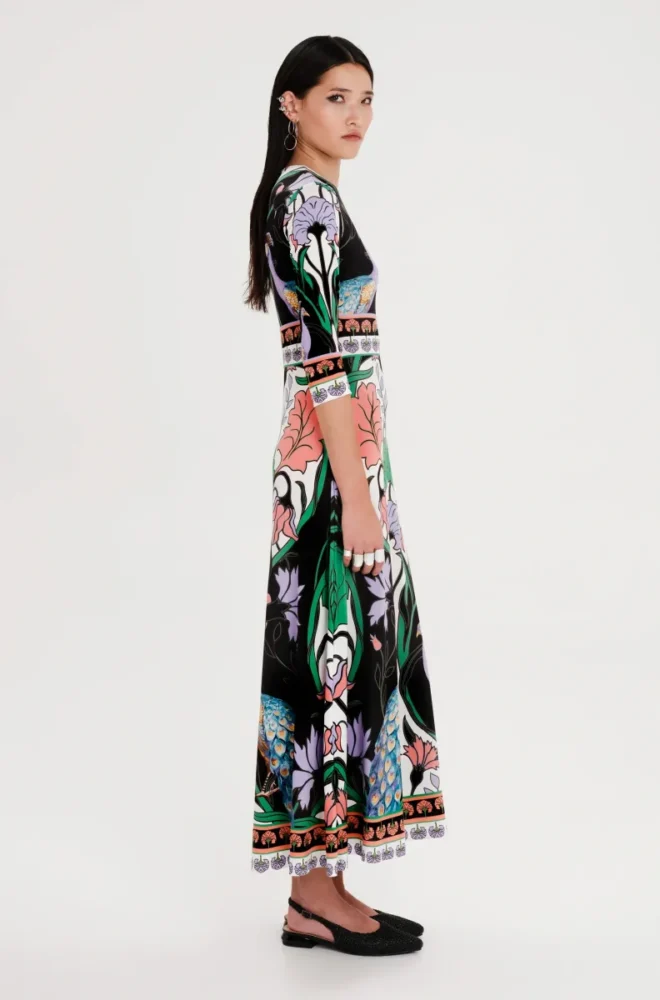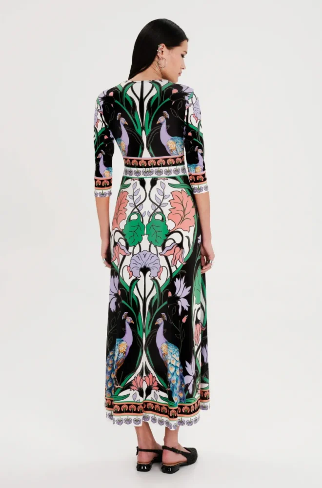Το Nostalgia Maxi Dress ξεχωρίζει με τη χαρακτηριστική P+C γραμμή του και είναι φτιαγμένο από μαλακό, ελαστικό jersey ύφασμα. Εφαρμόζει στη μέση, ενώ η φούστα του ανοίγει σε Α-γραμμή. Είναι ένα μακρύ φόρεμα με μανίκια ¾ και placement print που κολακεύει το σώμα, με παγώνια και έντονα χρώματα εμπνευσμένα από εξωτικά πουλιά. Φορέστε το σε πρωινά events, καλοκαιρινά βράδια ή σε ιδιαίτερες ξεχωριστές εμφανίσεις σας.