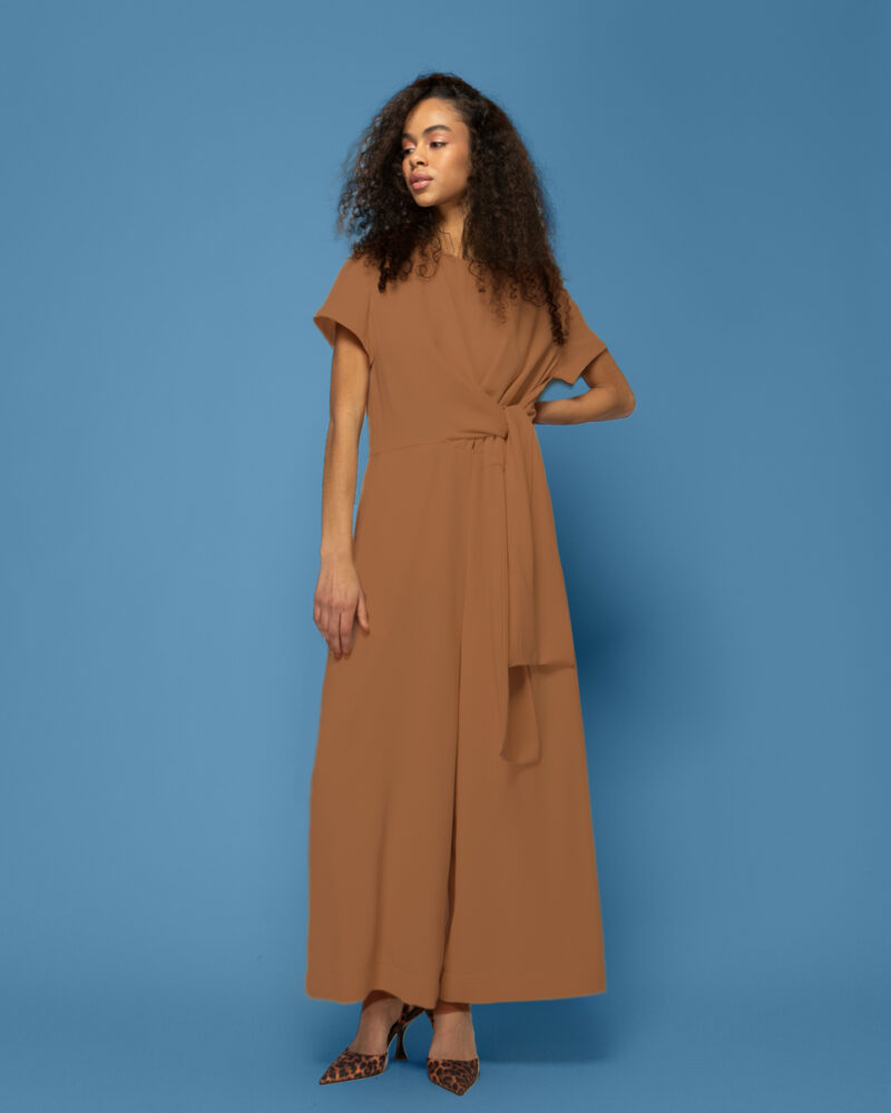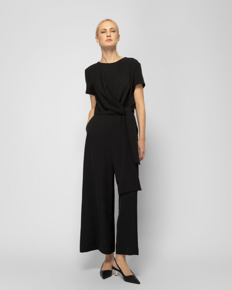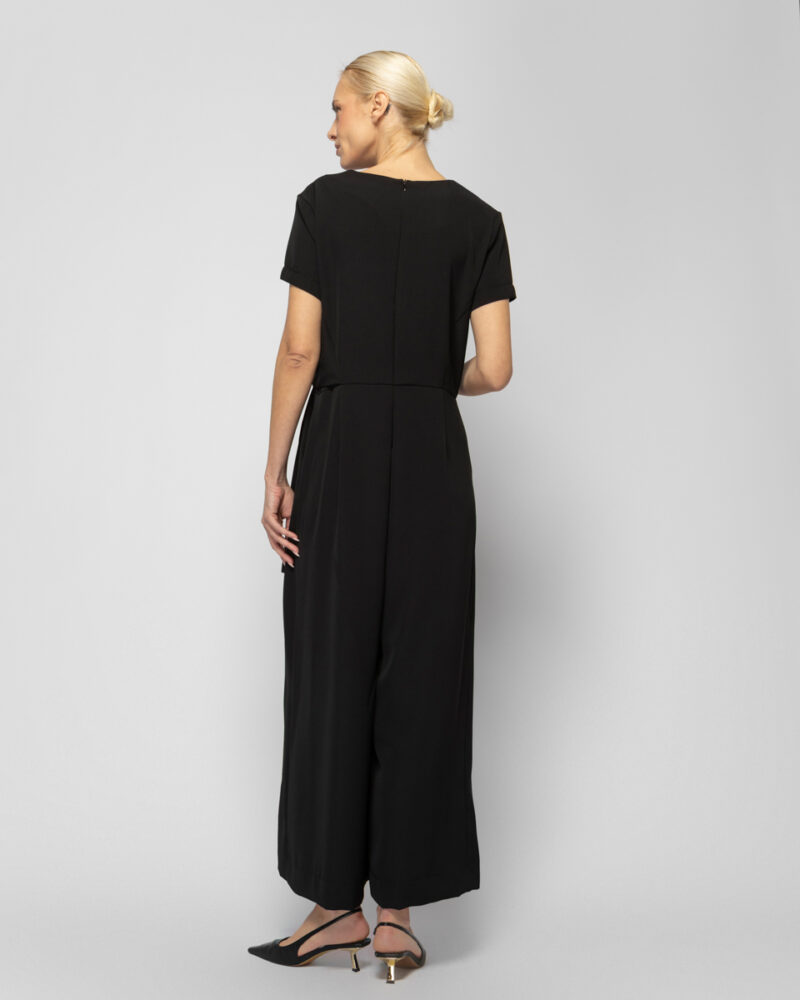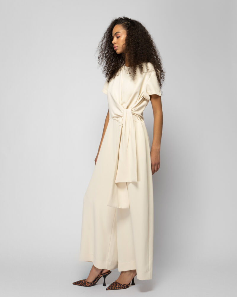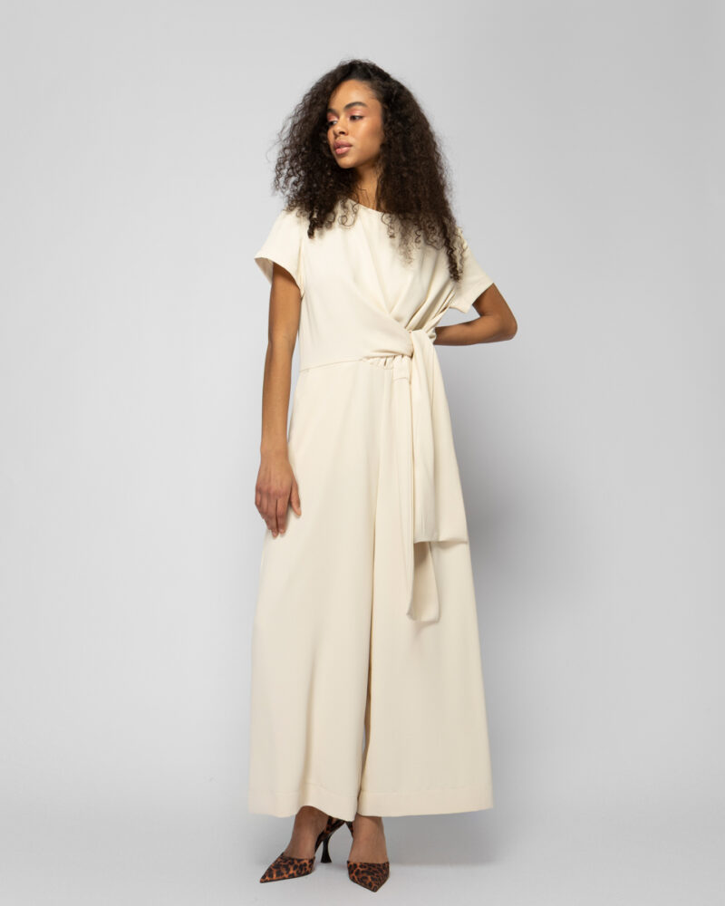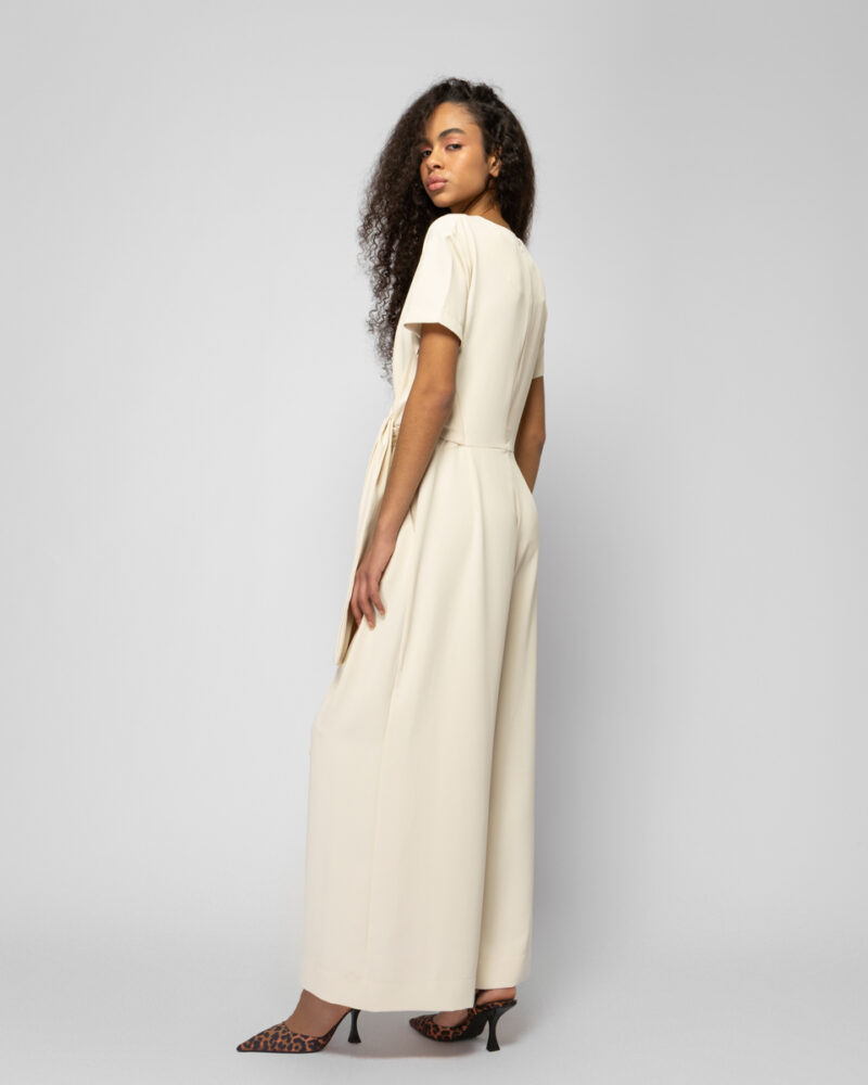 Ολόσωμη φόρμα αστραγάλου με φαρδιά μπατζάκια, κλείσιμο στην πλάτη με φερμουάρ, δέσιμο στο μπροστινό μέρος της μέσης & τσέπες.