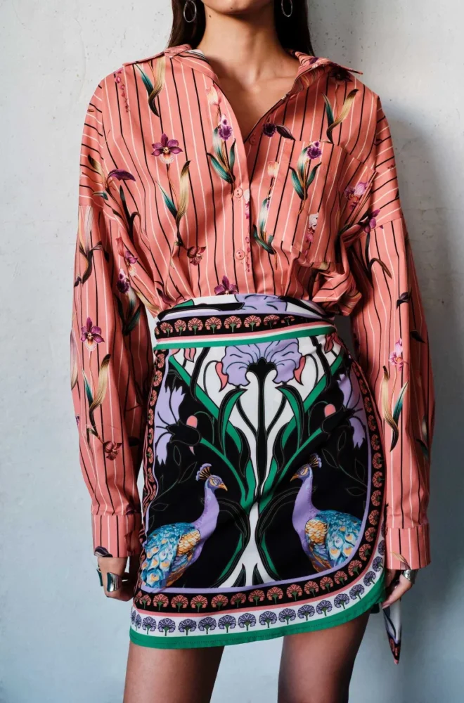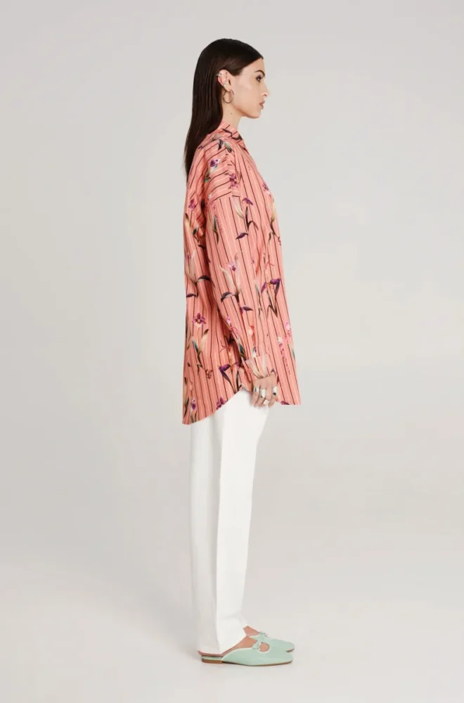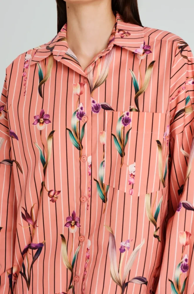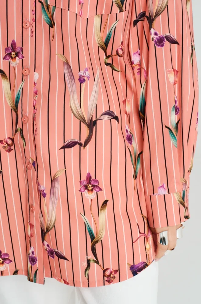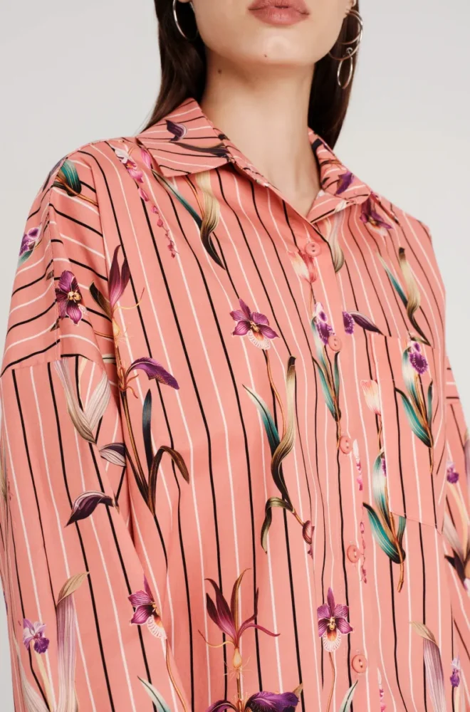 Το Orchid Shirt ξεχωρίζει με τις έντονες ρίγες του, που ισορροπούν όμορφα με ένα θηλυκό floral all-over print σχέδιο. Εμπνευσμένο από το ανδρικό πουκάμισο, έχει oversized γραμμή και είναι φτιαγμένο από βαμβακερό poplin ύφασμα. Έχει κλασικό κούμπωμα με πατιλέτα, τσέπη στο στήθος και στρογγυλεμένο τελείωμα.