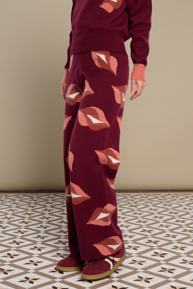 Ελαστικό πλεκτό παντελόνι. Φαρδύ μπατζάκι. Τύπωμα στα χείλη.