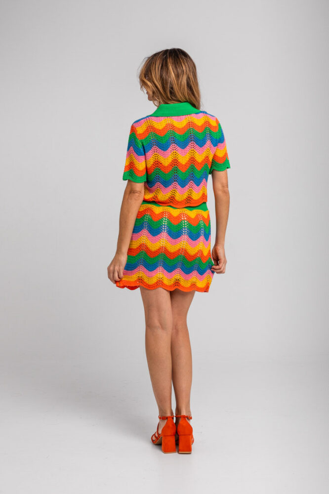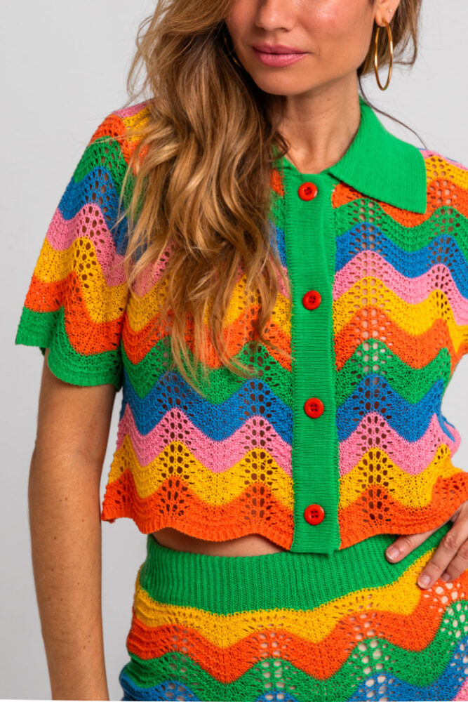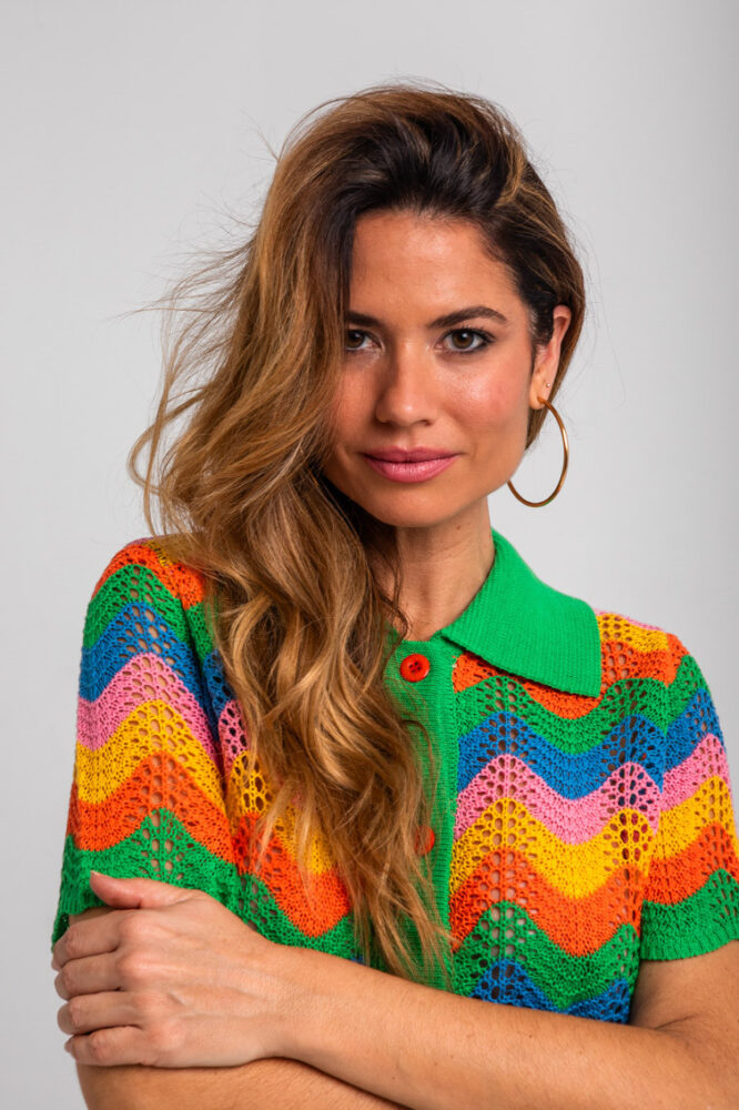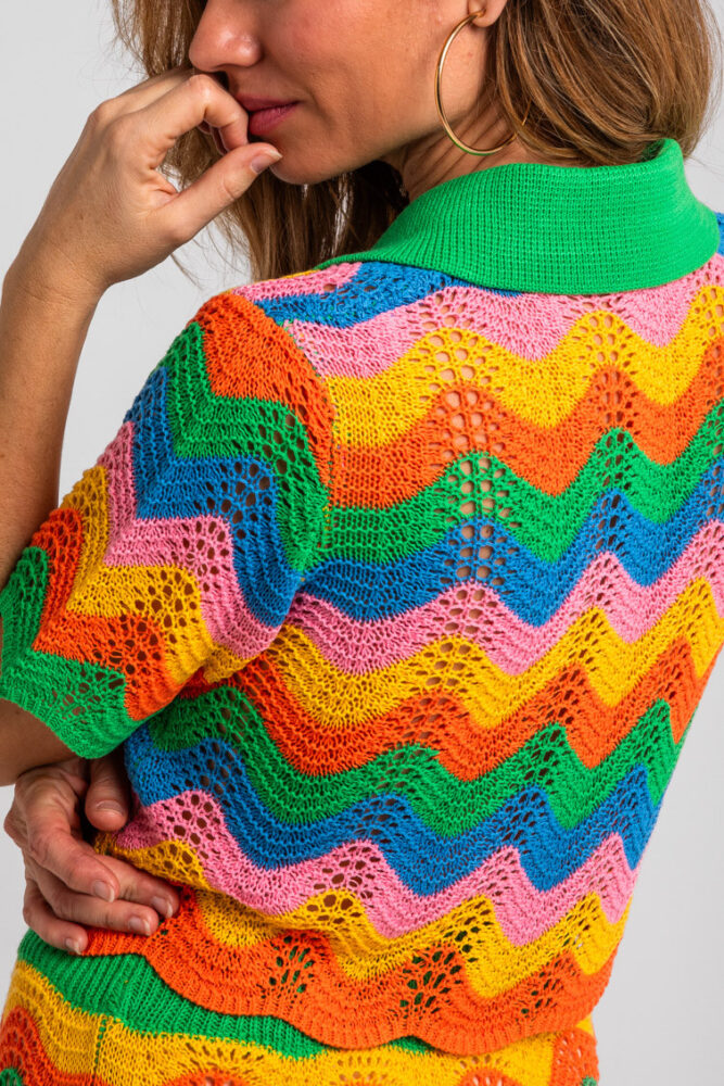 Échate flores: – Απαλό πλεκτό τοπ με κυματιστό σχέδιο και γιακά πουκαμίσου. Κοντό μανίκι με κλείσιμο με κουμπιά μπροστά. – 100% Ακρυλικό