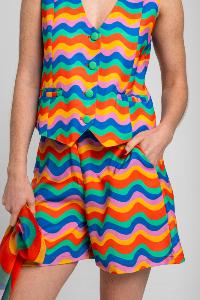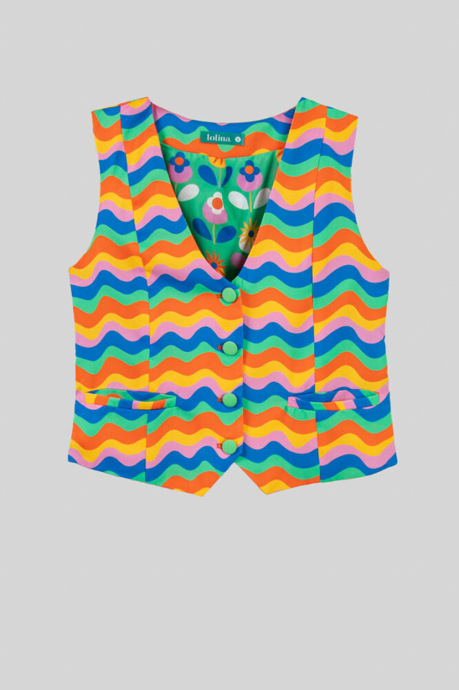 “Χάρισε στον εαυτό σου λουλούδια: Θα χαρίσω στον εαυτό μου λουλούδια” – Πολύχρωμο Γιλέκο με Κυματιστό Ραφτό Σχέδιο: Κοντό γιλέκο με V λαιμόκοψη, κλείσιμο με κουμπιά και ραφές που δένουν καλά μπροστά. Με επένδυση. – 100% Πολυεστέρας.
