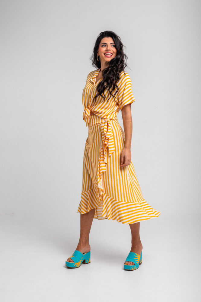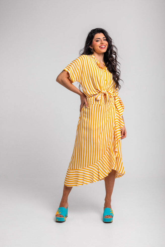Oh Sole mio: ήλιος, λίγος ήλιος, ζέστανέ με λίγο – Λευκό και κίτρινο ριγέ μπλουζάκι με γιακά μανταρινιού: Κοντό μανίκι με κλείσιμο με κουμπιά μπροστά και γιακά μανταρινιού. Το σχέδιο μπορεί να γίνει κοντό δένοντας έναν κόμπο στο μπροστινό στρίφωμα. Χαλαρή και άνετη εφαρμογή. – 100% βισκόζη
