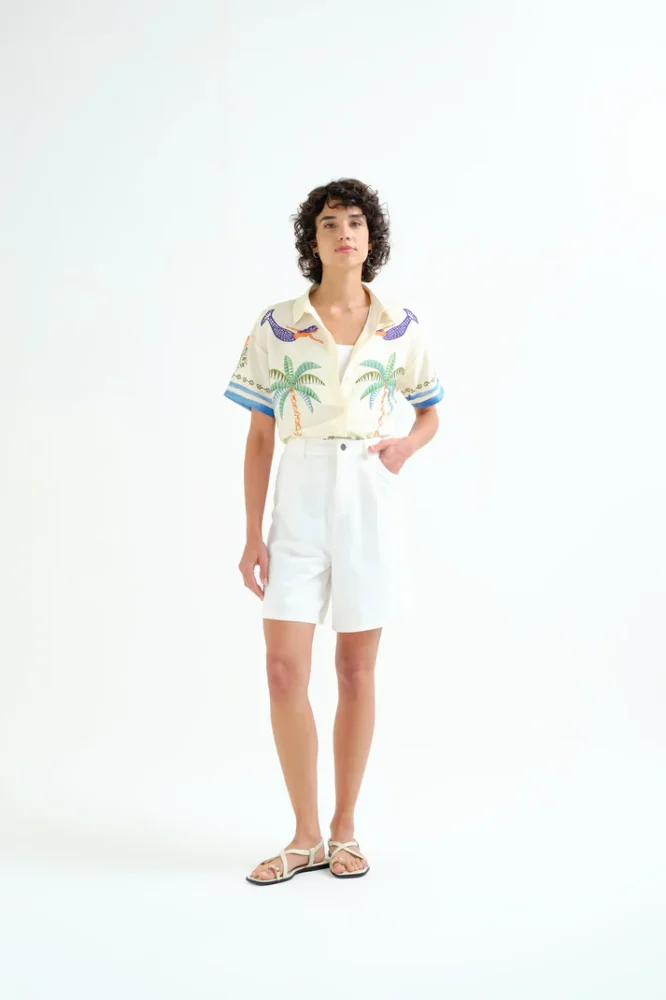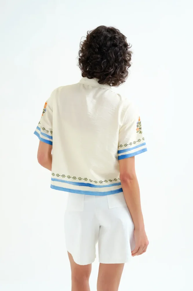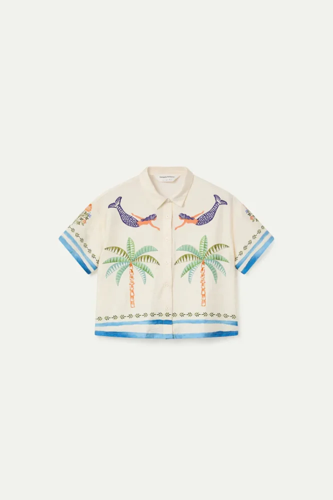 Κρεπ πουκάμισο με στάμπα φοίνικα και γοργόνα. Γιακάς με πέτο και κοντά μανίκια. Ελαφρώς χαμηλωμένοι ώμοι. Κλείσιμο με λευκά κουμπιά μπροστά. Το μοντέλο έχει ύψος 175 εκ. και φοράει μέγεθος S.