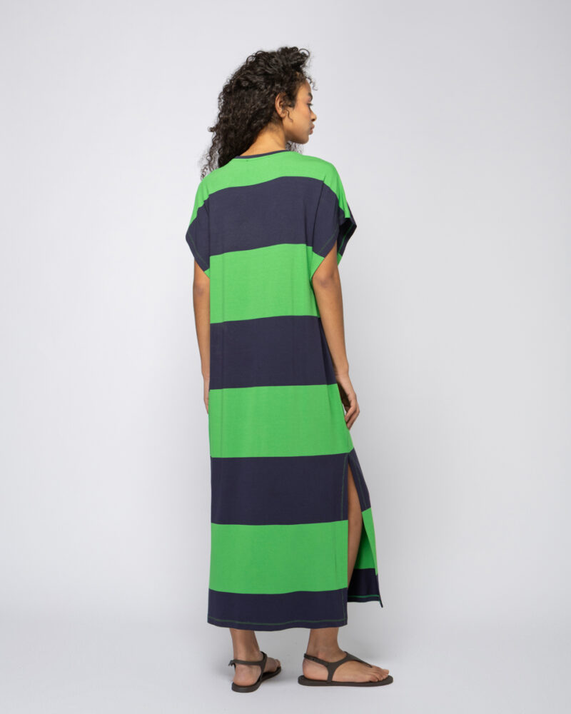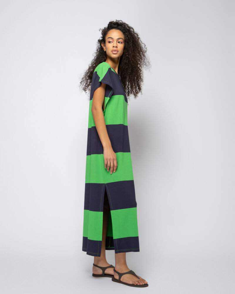 Ριγέ φόρεμα πράσινο με μπλε, με πεσμένους ώμους & σκισίματα στα πλαινά.