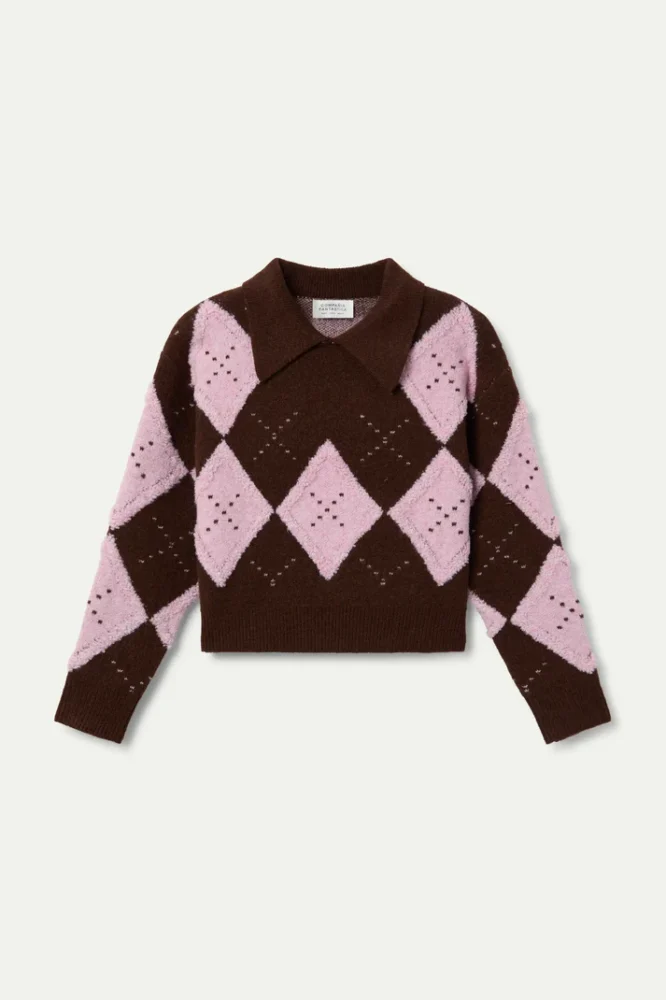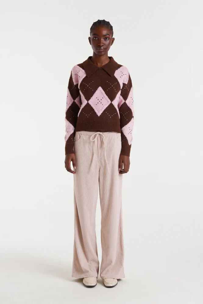 Ροζ και καφέ ζακάρ πουλόβερ με γιακά με πέτο και μακριά μανίκια. Ελαφρώς χαμηλωμένοι ώμοι. Λεπτομέρειες με κέντημα διαμαντιών και ριμπ τελείωμα. Το μοντέλο έχει ύψος 178 εκ. και φοράει μέγεθος S.