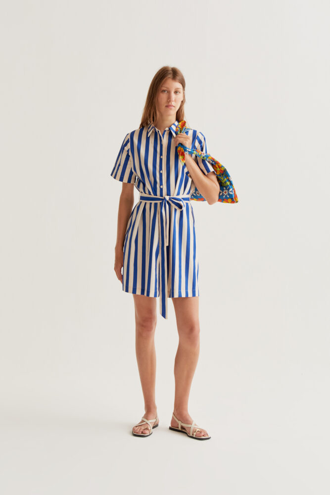 Κοντό φόρεμα από 100% βαμβάκι με μπλε τύπωμα ριγέ. Γιακάς με πέτα και κοντά μανίκια. Κλείσιμο με κουμπιά μπροστά και λευκά κουμπιά. Δέσιμο στη μέση. Το μοντέλο έχει ύψος 177 εκ. και φοράει μέγεθος S.