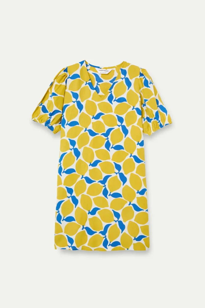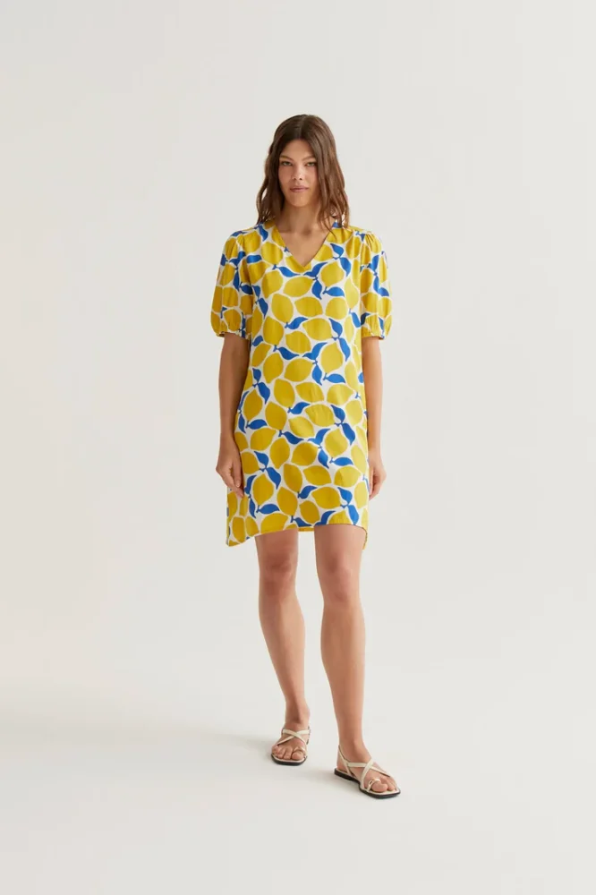 Κοντό φόρεμα με τύπωμα limoncello. V ντεκολτέ και ελαφρώς φουσκωτά μανίκια 3/4 που ολοκληρώνονται με ελαστικές μανσέτες. Χαλαρή εφαρμογή. Το μοντέλο έχει ύψος 177 εκ. και φοράει μέγεθος S.