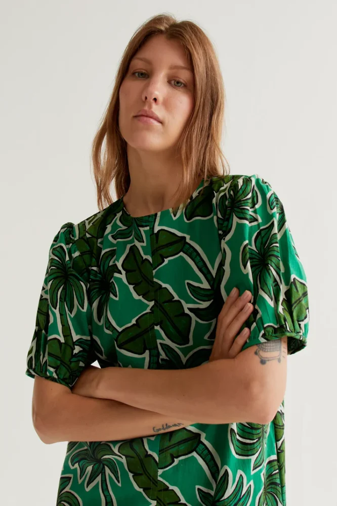 Κοντό φόρεμα από 100% βαμβάκι με τύπωμα φοίνικα. Στρογγυλή λαιμόκοψη και ελαφρώς φουσκωτά κοντά μανίκια. Το μοντέλο έχει ύψος 177 εκ. και φοράει μέγεθος S.