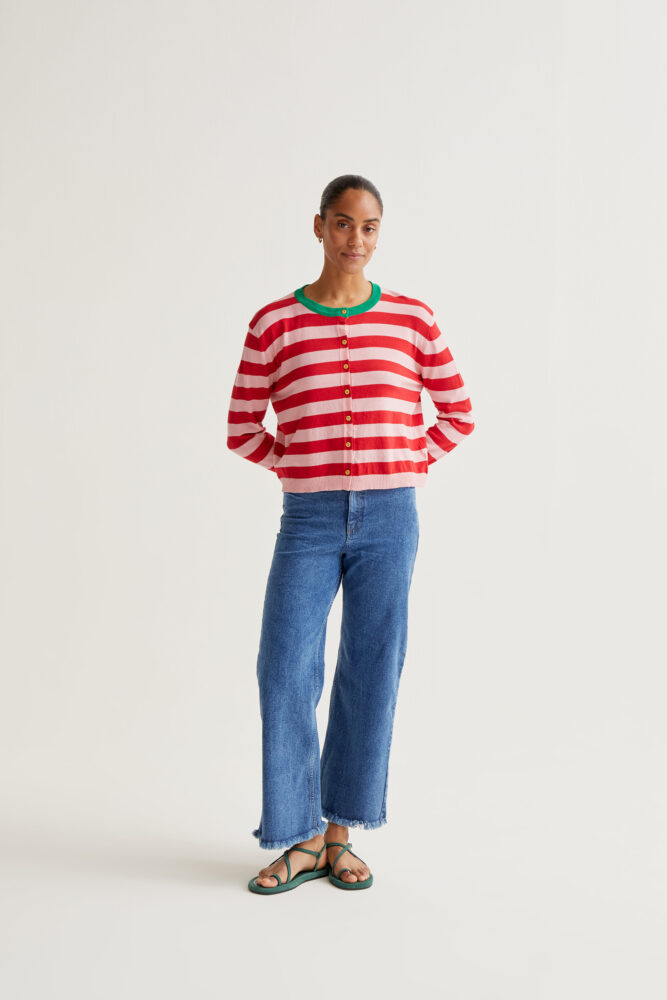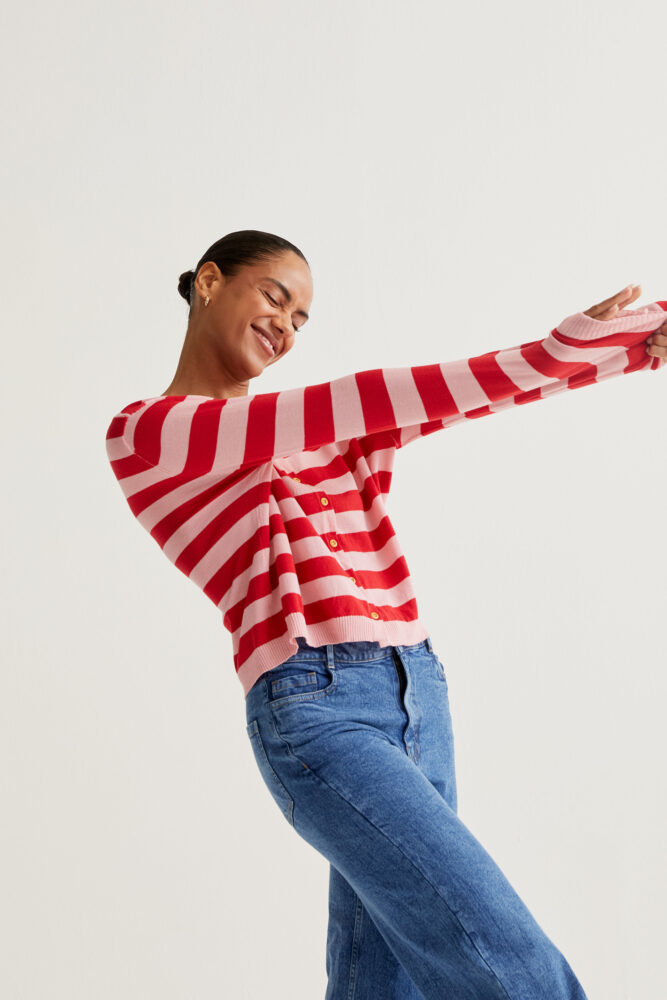 Ζακέτα από πλεκτό ύφασμα με ροζ και κόκκινες ρίγες. Στρογγυλή λαιμόκοψη σε πράσινο χρώμα σε αντίθεση. Κλείσιμο με κουμπιά μπροστά και κίτρινα κουμπιά. Λεπτομέρειες με ριμπ τελείωμα. Το μοντέλο έχει ύψος 175 εκ. και φοράει μέγεθος S.
