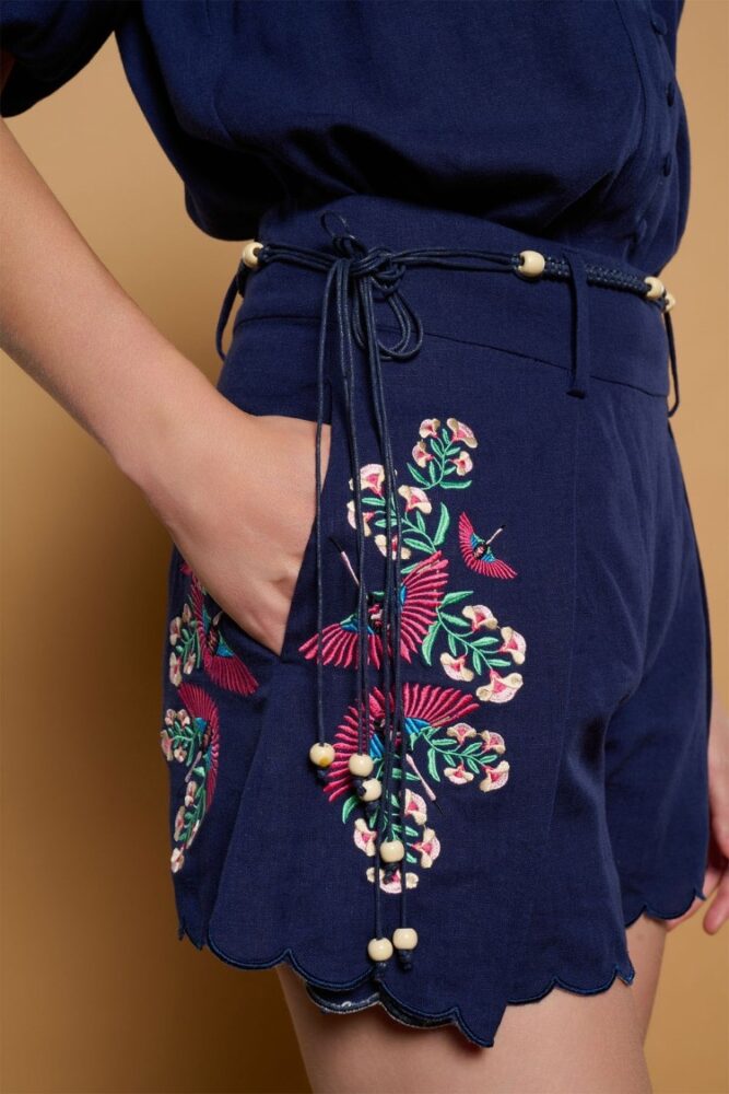 Ψηλόμεσο σορτς. Λεπτή ζώνη με κορδόνι και λεπτομέρεια με χάντρες. Κεντημένα λουλούδια και κολίβρια σε αντίθεση στα πλάγια. Στρογγυλό στρίφωμα. Ύφασμα από μείγμα βισκόζης και λινού. Κλείσιμο με φερμουάρ στο πίσω μέρος.