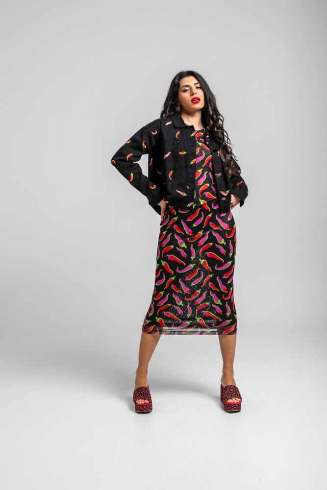 Denim jacket μαύρο με κεντητές πιπεριές LOLINA