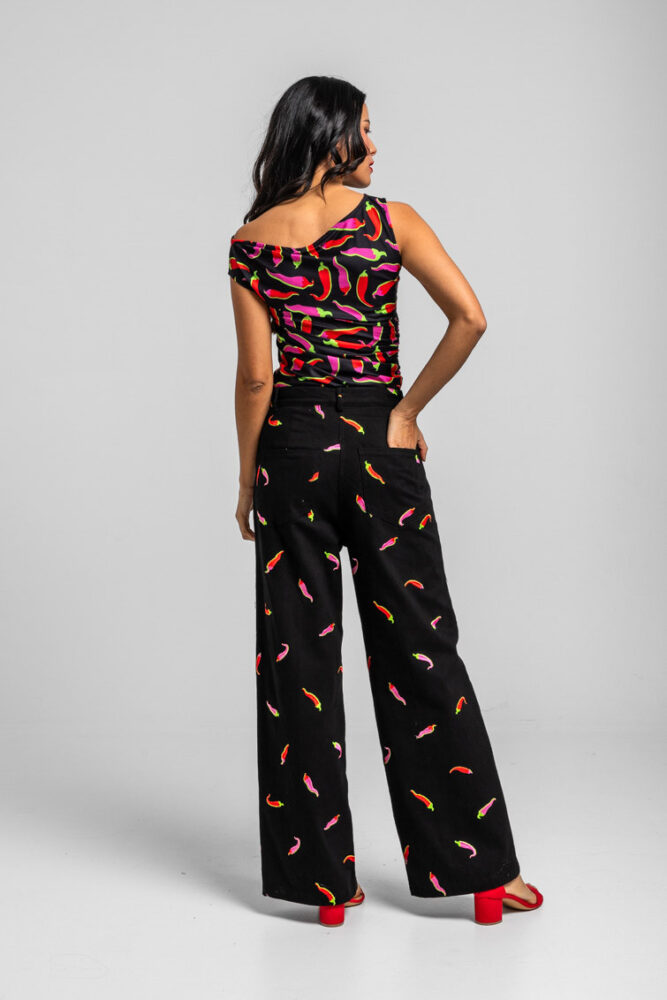 Denim παντελόνι μαύρο με κεντητές πιπεριές LOLINA