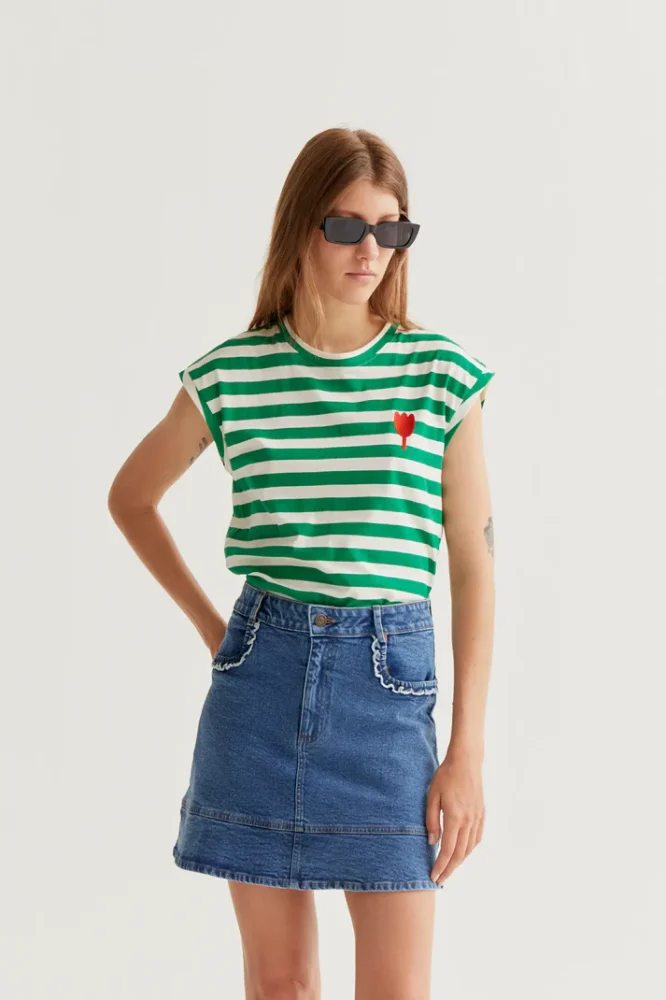 T-shirt with green striped print and tulip embroidery COMPANIA FANTASTICA